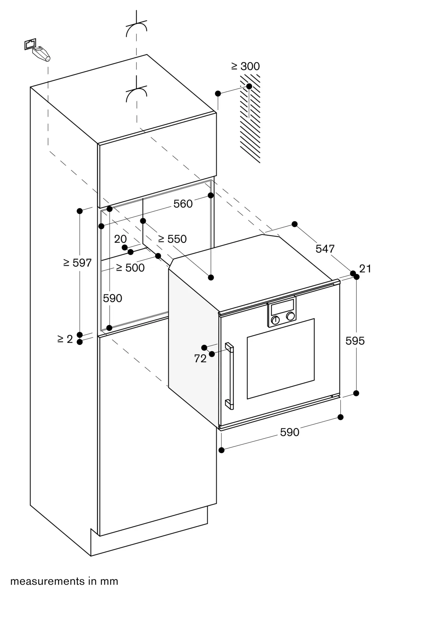 The mains socket needs to be planned outside the built-in niche.