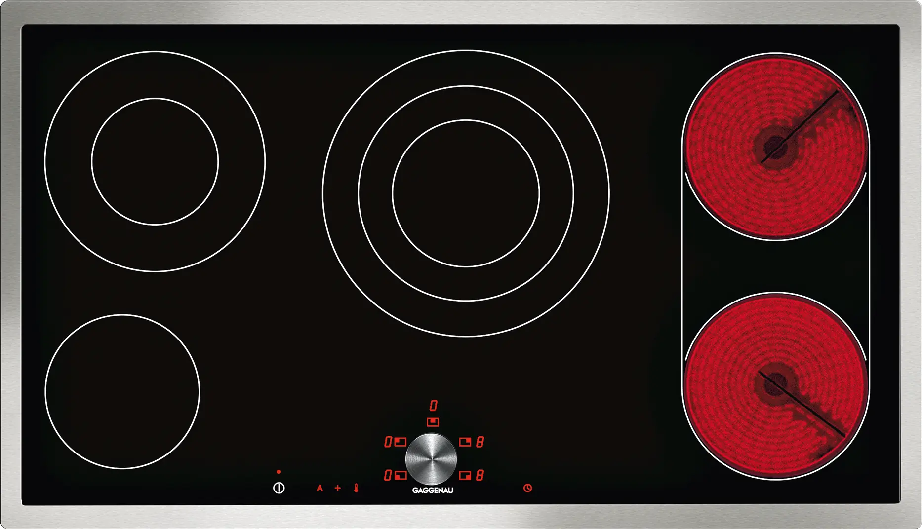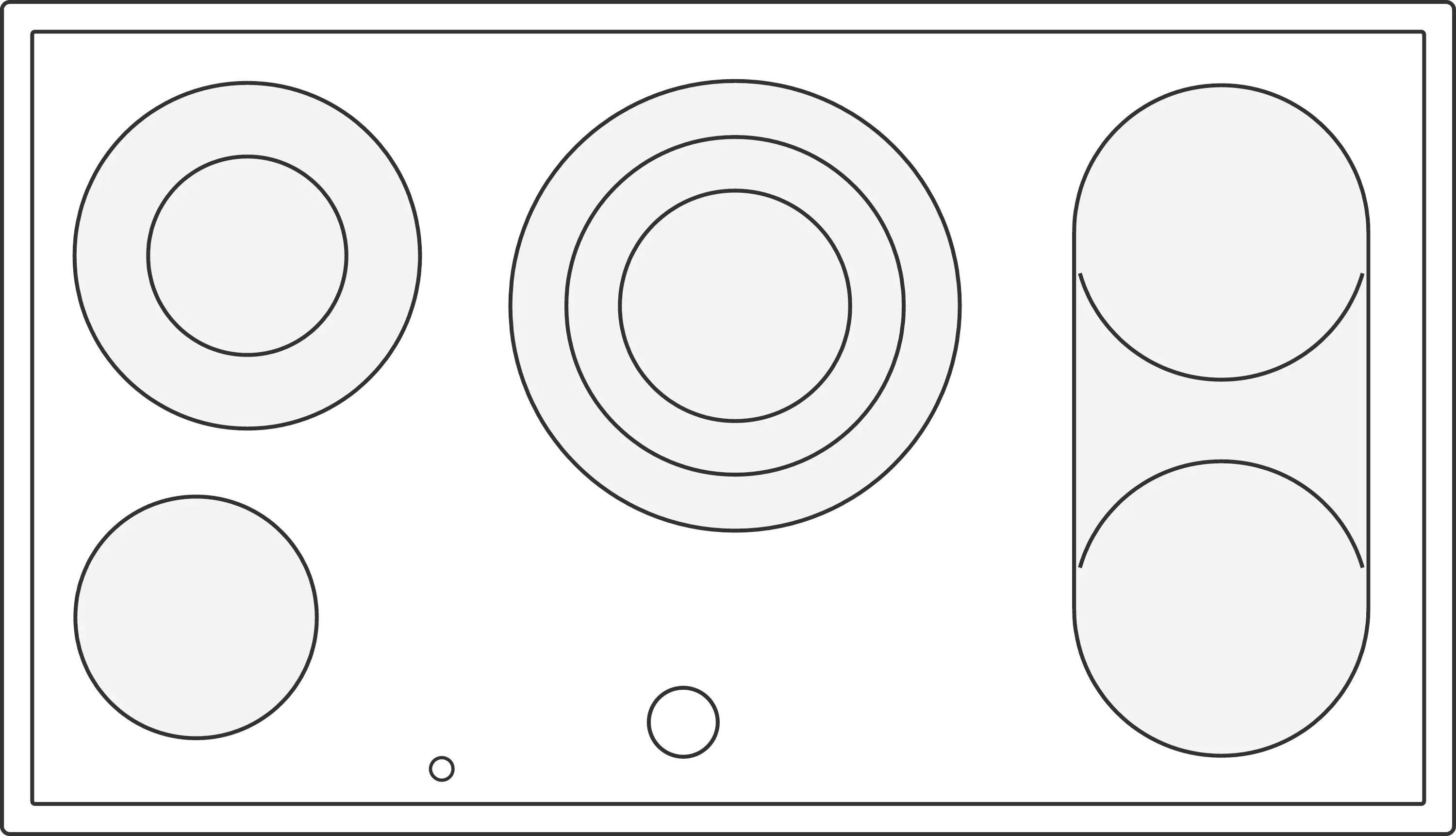 1 Super-Quick cooking zone ø 14.5 cm (1050 W), converts to ø 21 cm (2200 W) or ø 27 cm (3080 W) cooking zone.
