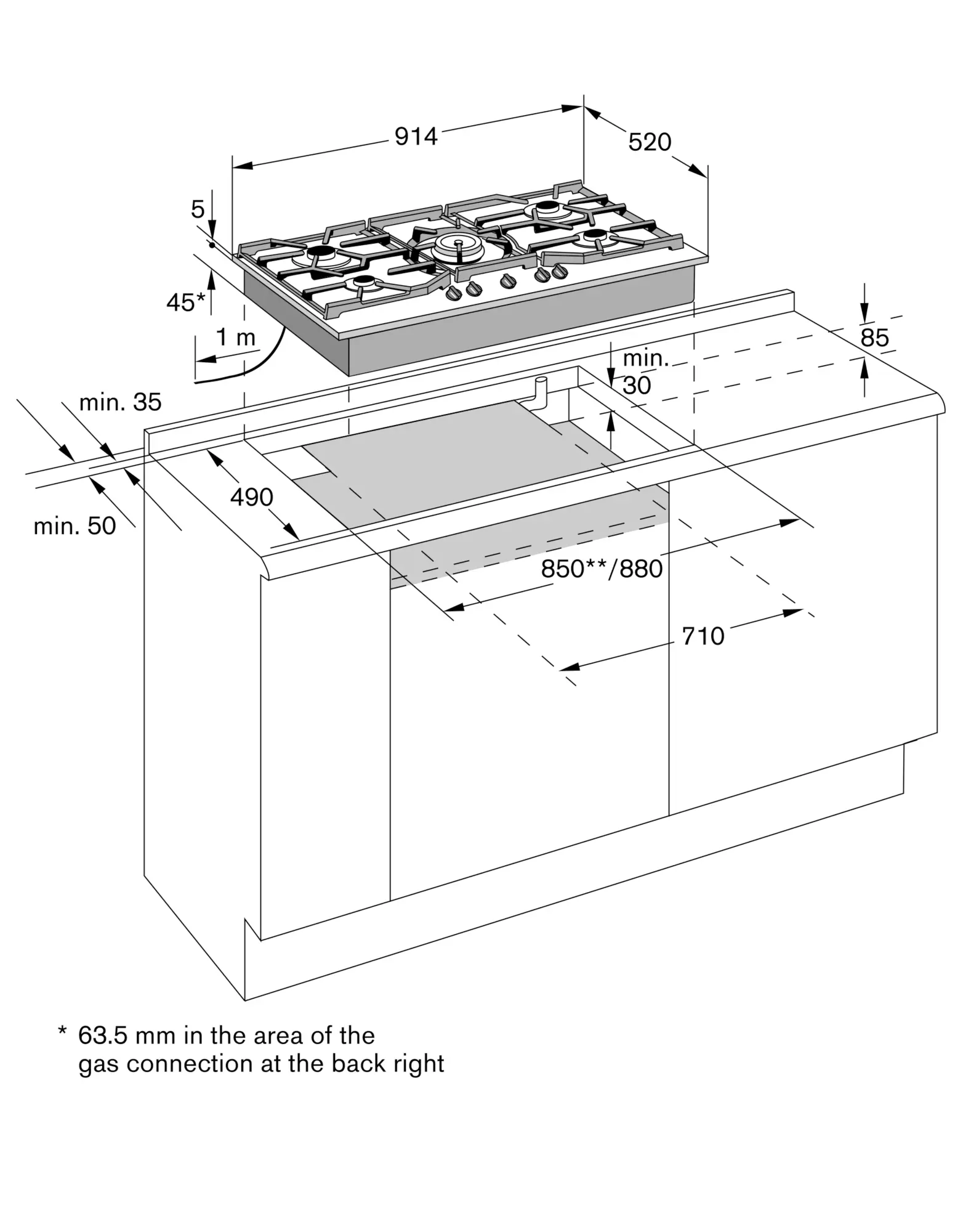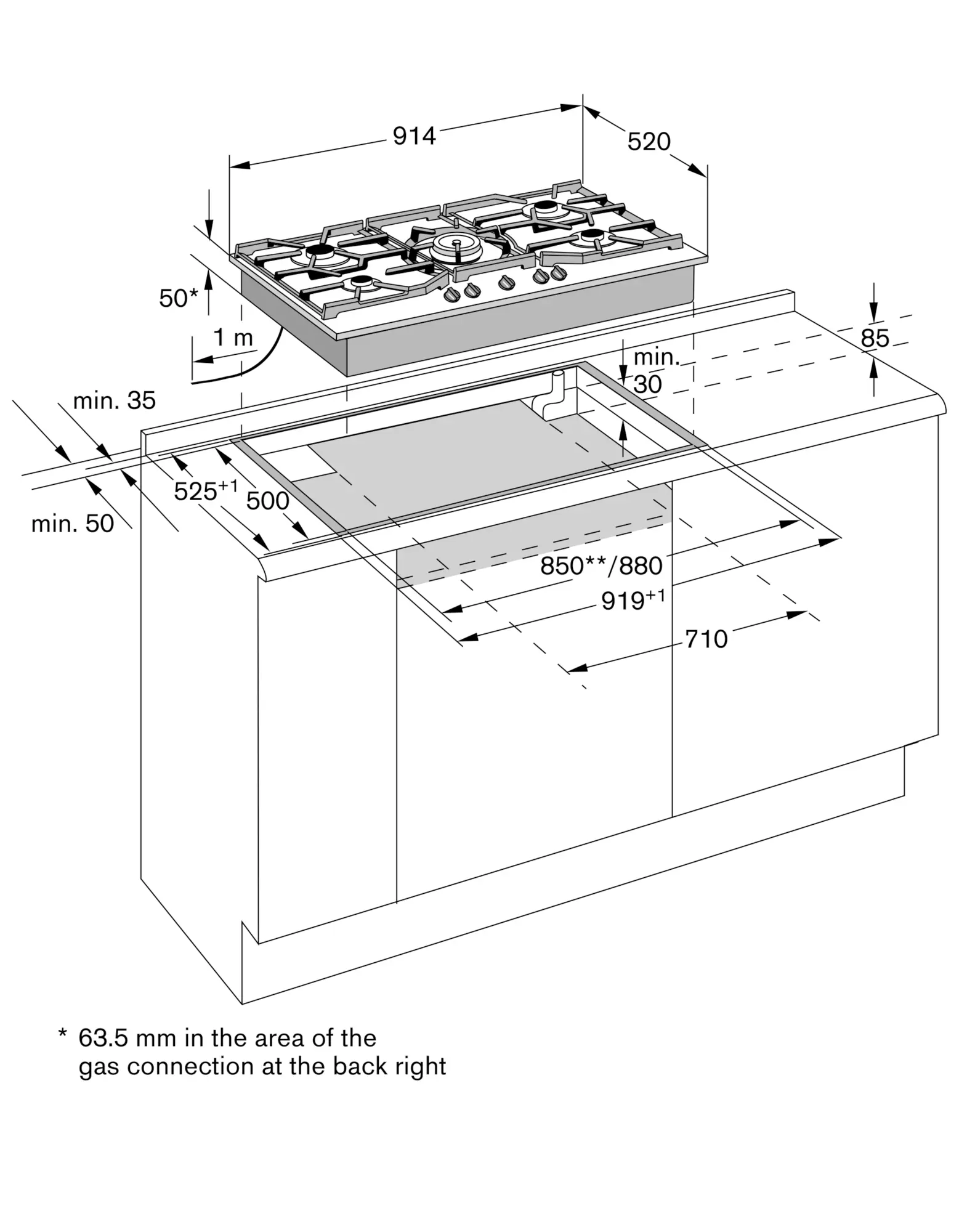With a total connected load of more than 11 kW local regulations concerning room ventilation, room size and combination of extraction or recirculation hoods must be observed. Minimum clearance between gas cooktop(s) with more than 11 kW and ventilation hood 70 cm.