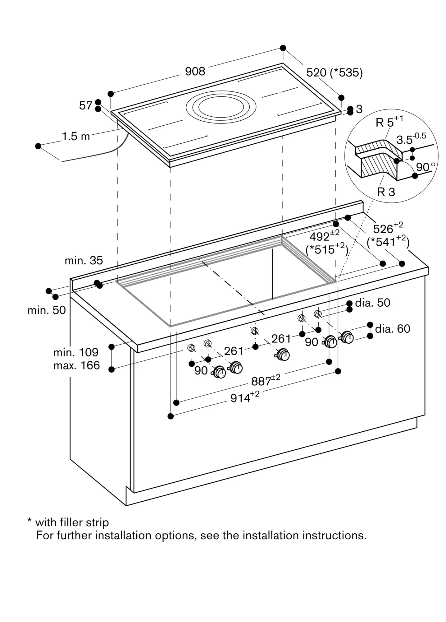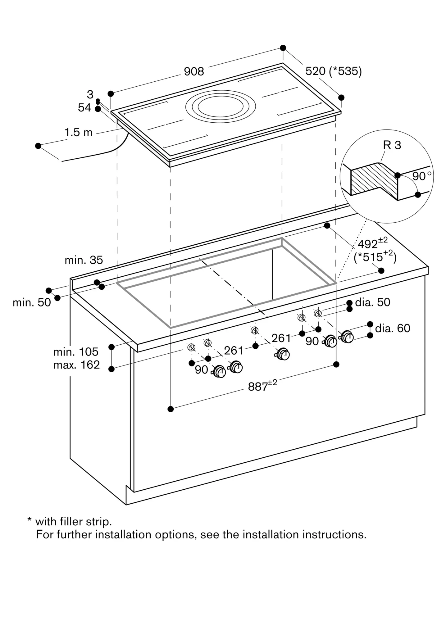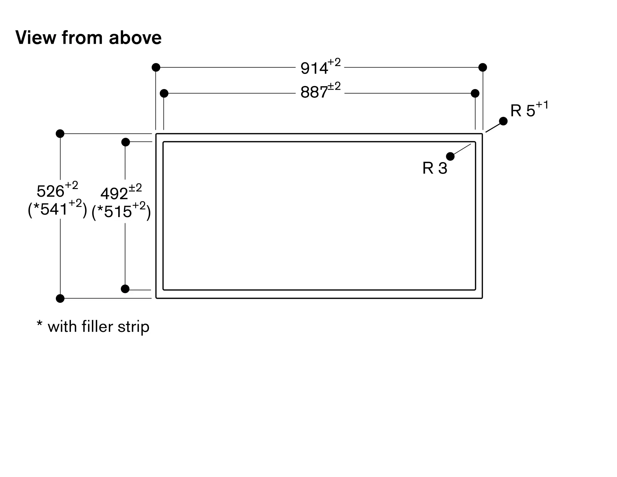 The bearing capacity and stability, in the case of thin worktops in particular, must be supported using suitable substructures. Take into account the appliance weight and additional loads.