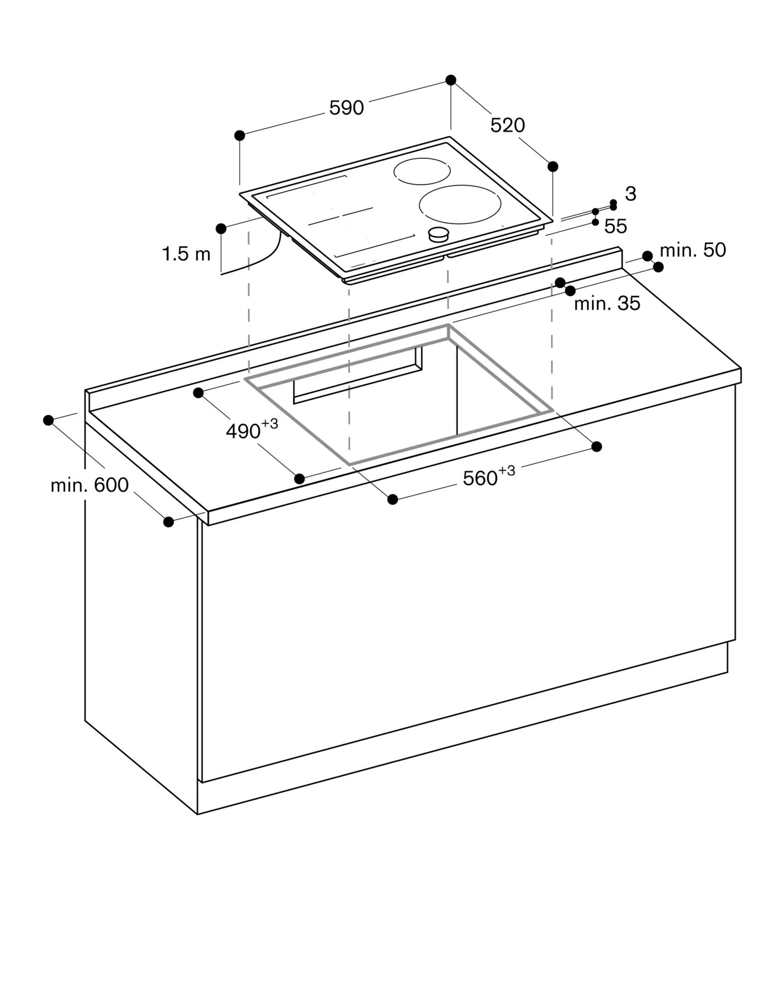 Cooktop clamping range: 20 - 40 mm.