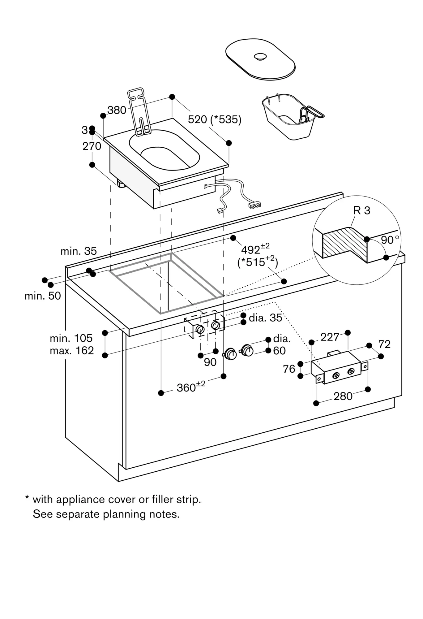 If installing with the appliance cover VA 440 or filler strip VA 450 take into account the additional space required for the depth.