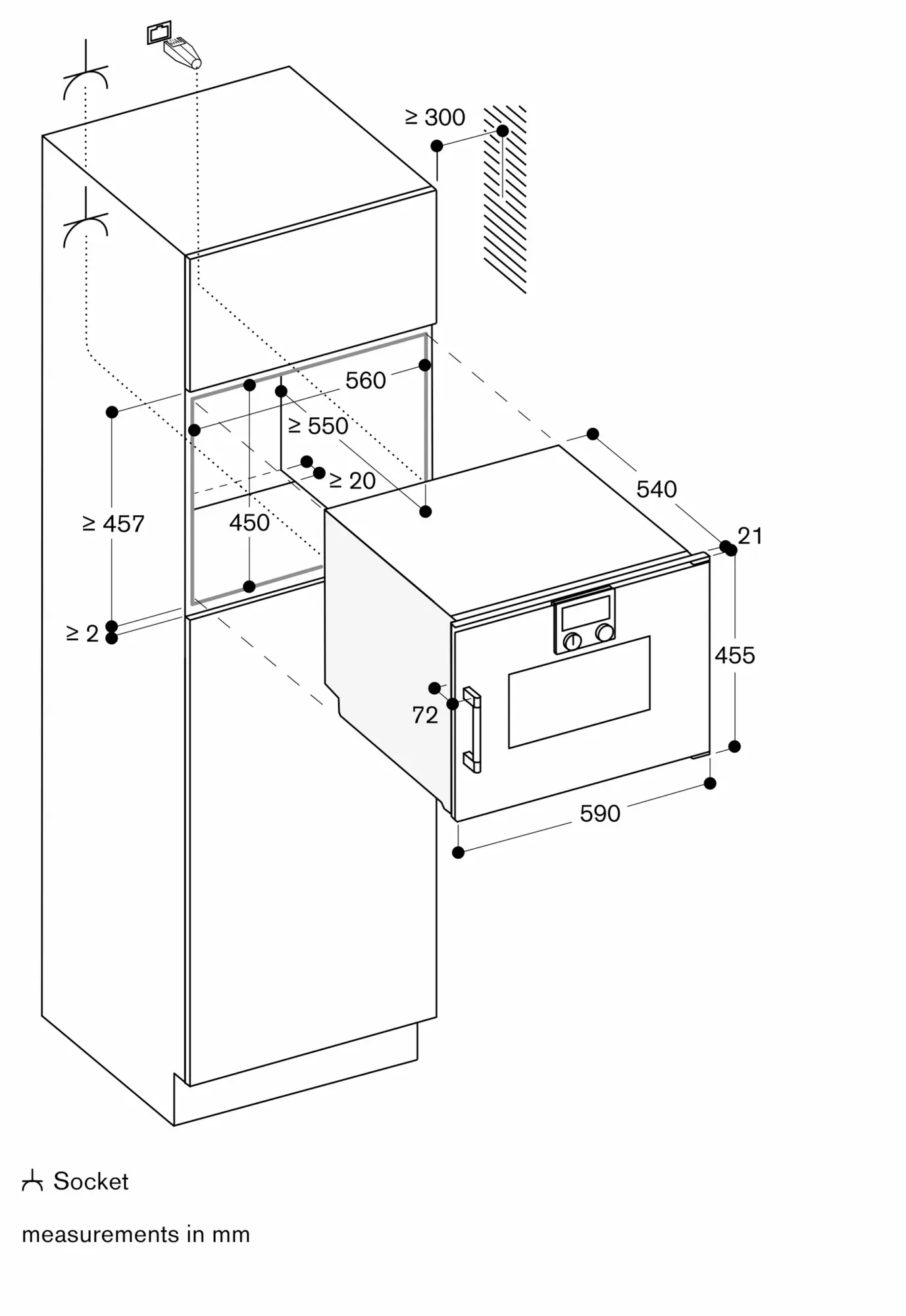 The mains socket needs to be planned outside the built-in niche.