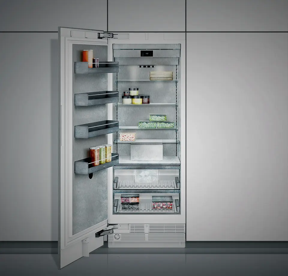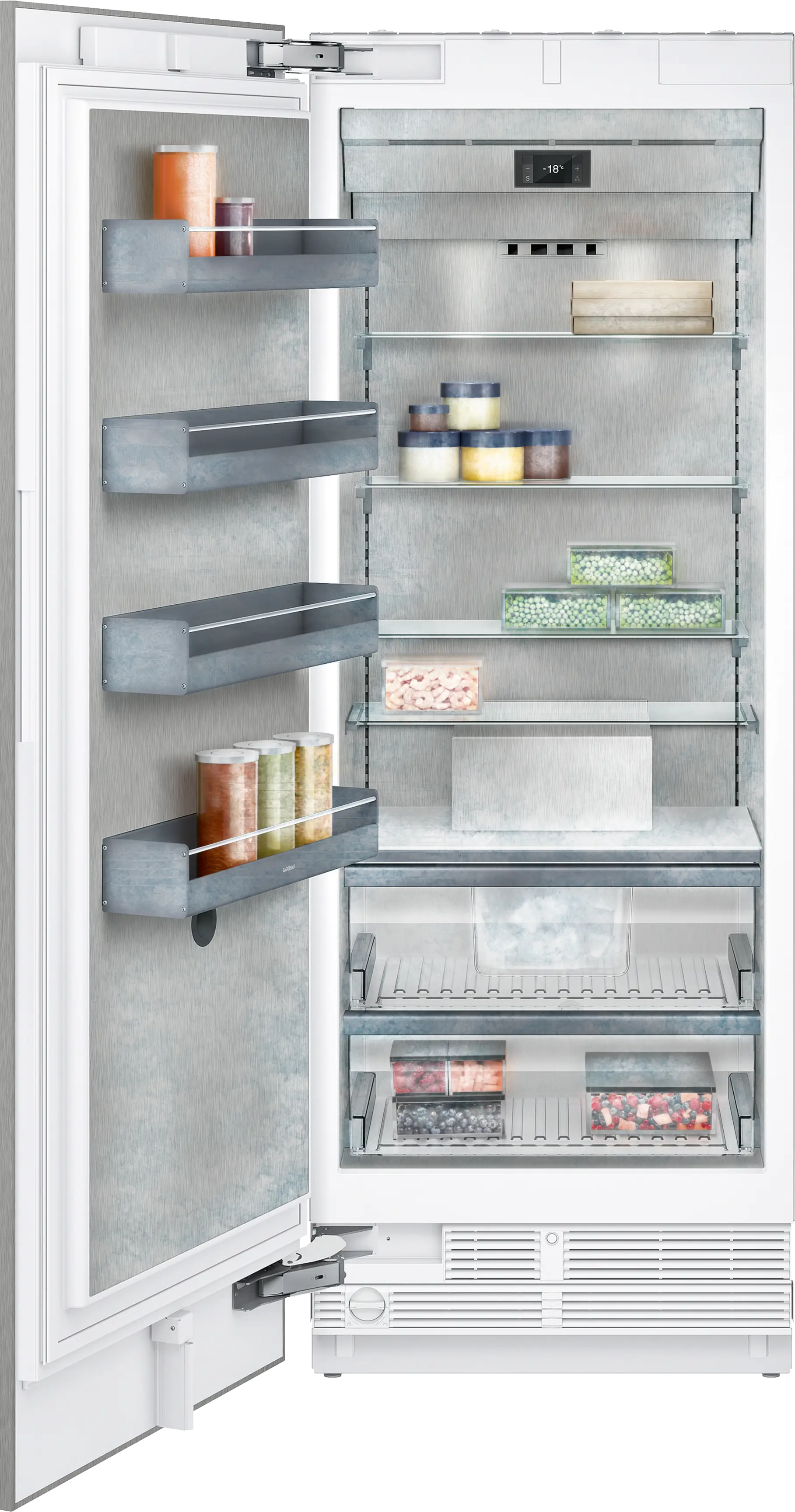 The drawers in the RC and RF models are positioned at the same height. With side-by-side installation, the glass shelves and door racks can be aligned on the same level