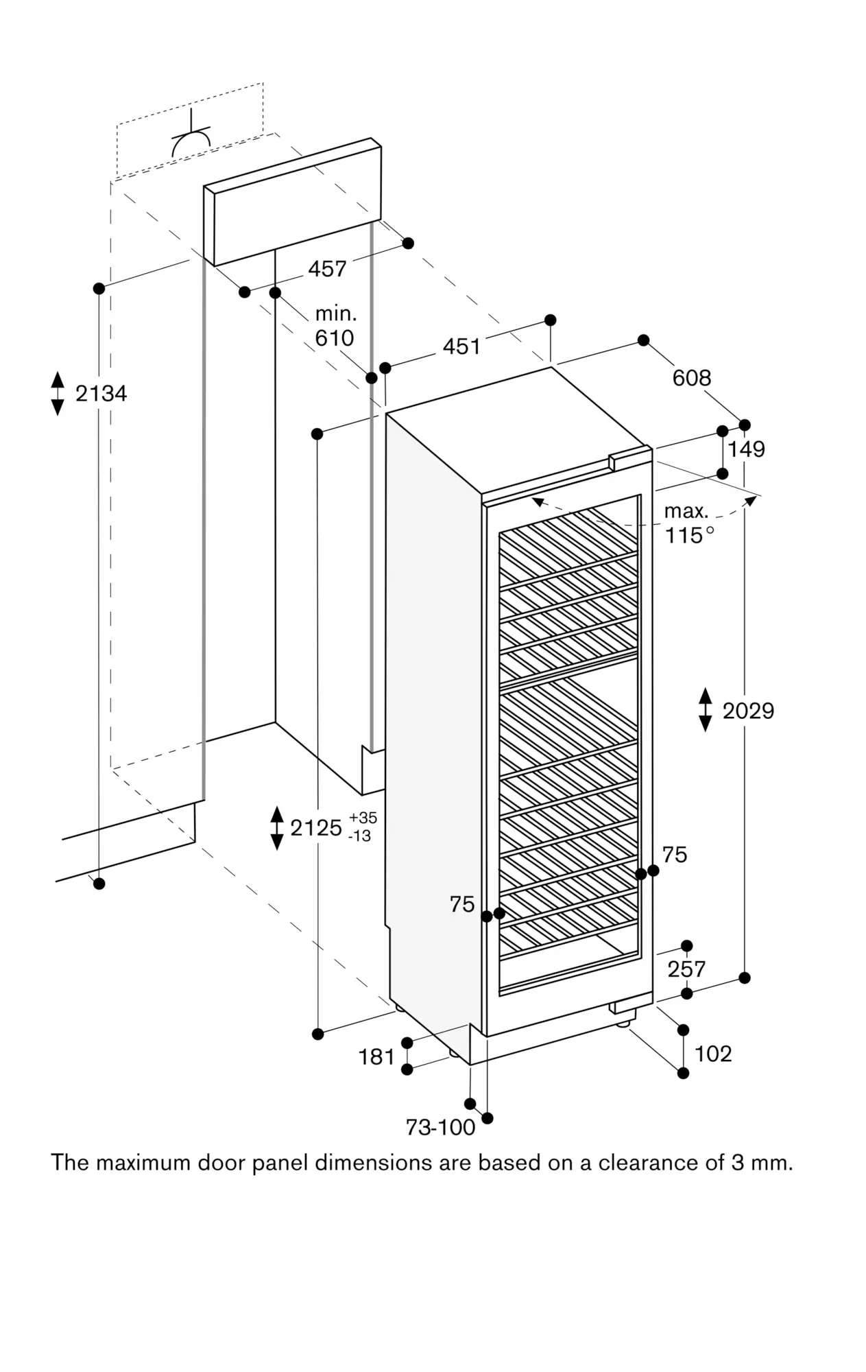 Door opening angle of 115°, fixable at 90°.