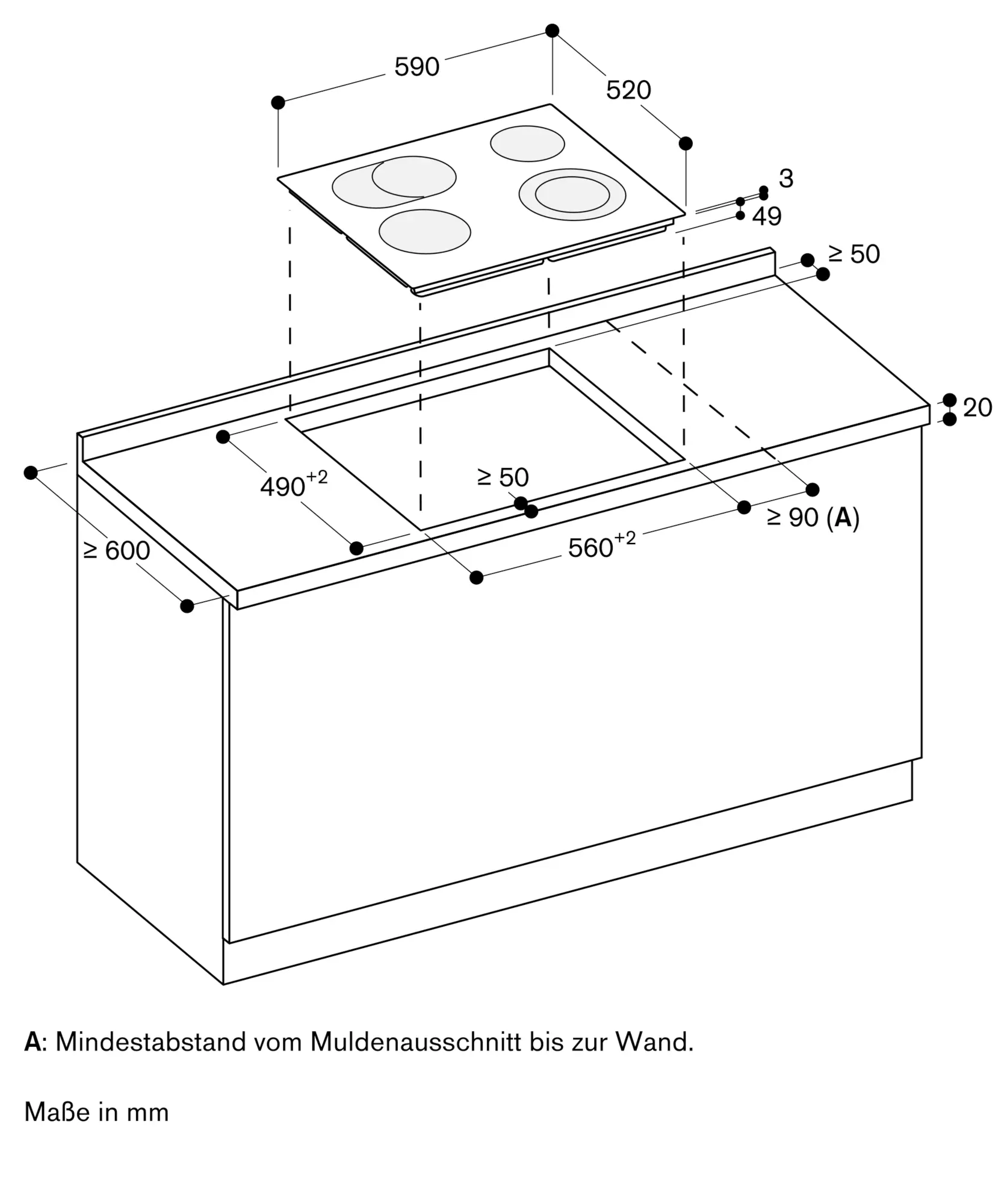 Das Kochfeld muss von unten frei zugänglich sein, um die Wanne des Kochfeldes nach unten abnehmen zu können.