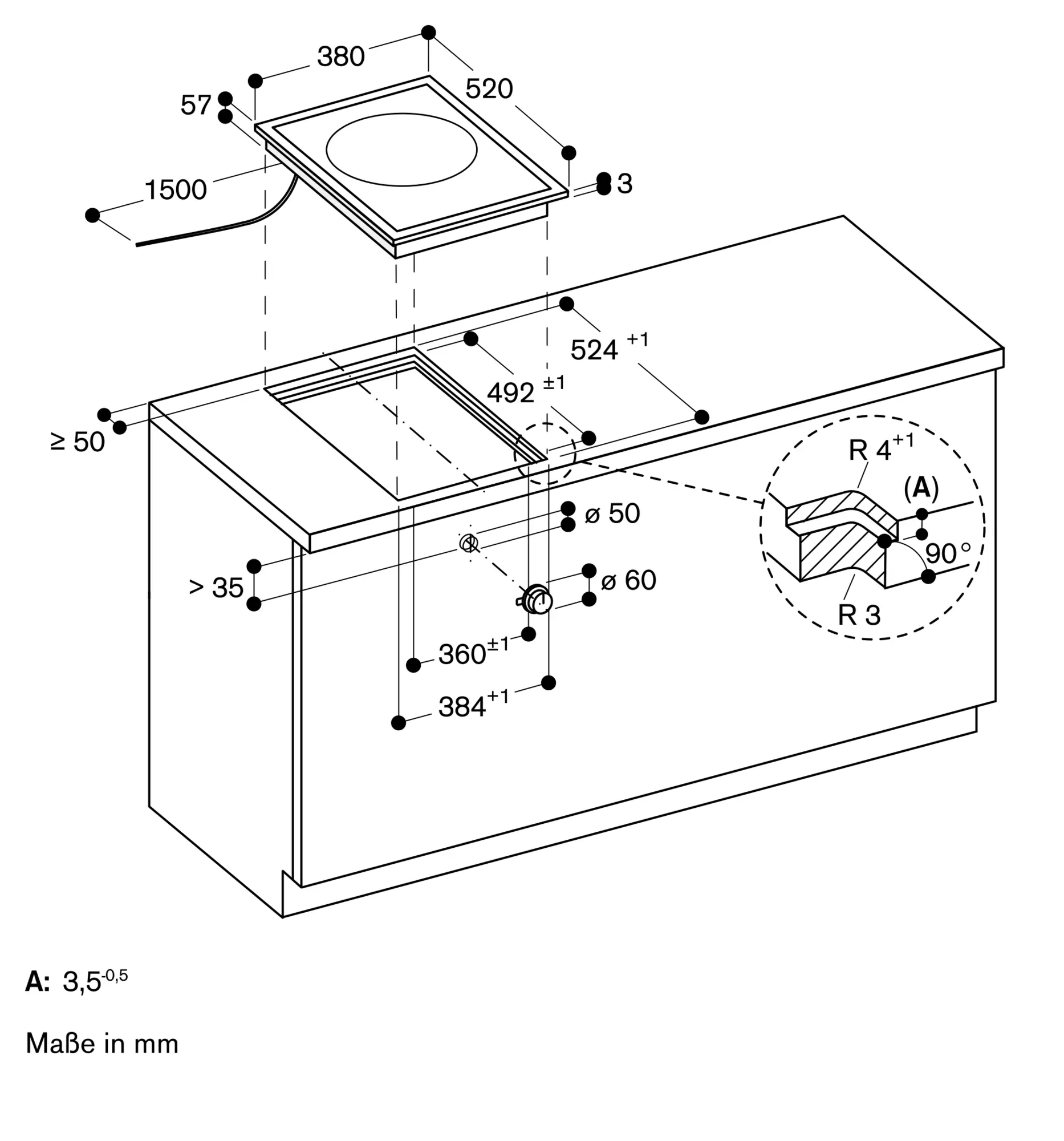 Der Einbau eignet sich in Arbeitsplatten aus Stein, synthetischem Material oder Massivholz. Hitzebeständigkeit und wasserdichte Versiegelung der Schnittkanten sind zu berücksichtigen. Bei anderen Materialien stimmen Sie sich bezüglich der Verwendung mit dem Arbeitsplatten-Hersteller ab.