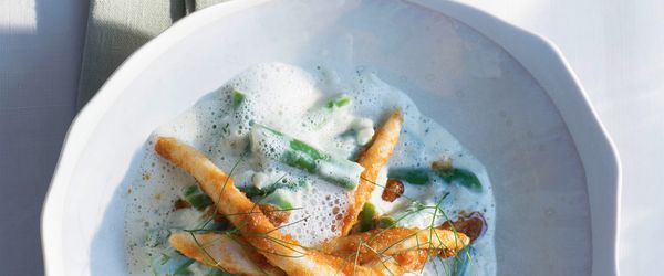 für die Fisolen: 600 g gelbe oder grüne Fisolen · Salz · 1 weiße Zwiebel (ca. 180 g) · 2 EL Butter · 1 EL glattes Mehl · 200 ml Gemüsefond S. 232 · 150 g Sauerrahm · Chilipulver · 1 unbehandelte Zitrone · 2 Zweige Dill |