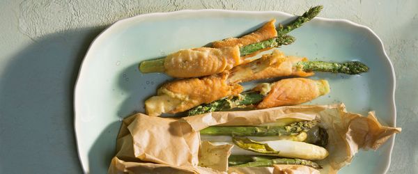 Wir haben in Österreich ja den Ruf, alles zu panieren. Machen wir gerne, diesmal mit Bärlauchtopfen und Räucherlachs umhüllten Spargel.