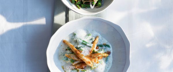 für die Fisolen: 600 g gelbe oder grüne Fisolen · Salz · 1 weiße Zwiebel (ca. 180 g) · 2 EL Butter · 1 EL glattes Mehl · 200 ml Gemüsefond S. 232 · 150 g Sauerrahm · Chilipulver · 1 unbehandelte Zitrone · 2 Zweige Dill |