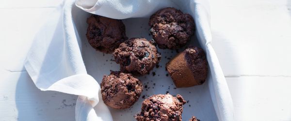 für die Muffins: 250 g Heidelbeeren (bevorzugt Waldheidelbeeren) · 1 Vanilleschote · 2 Eier · 75 g Kristallzucker · 200 ml Milch · 100 ml kaltgepresstes Mandelöl (ersatzweise neutrales Pflanzenöl) · Salz · 80 g Schokoladenlinsen oder -Stücke (0,5 cm) · 200 g griffiges Mehl · 60 g Kakaopulver · 1 TL Backpulver für die Schoko-Gewürzstreusel: |