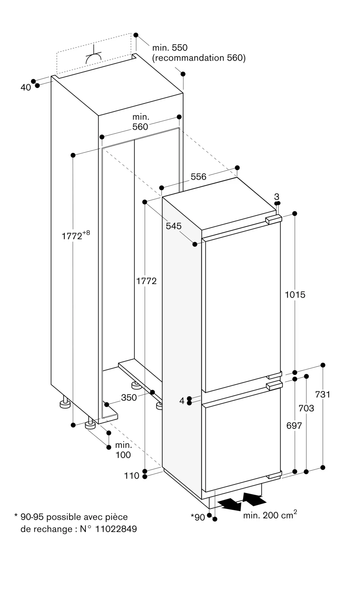 Espace nécessaire entre les façades de meuble 4 mm.