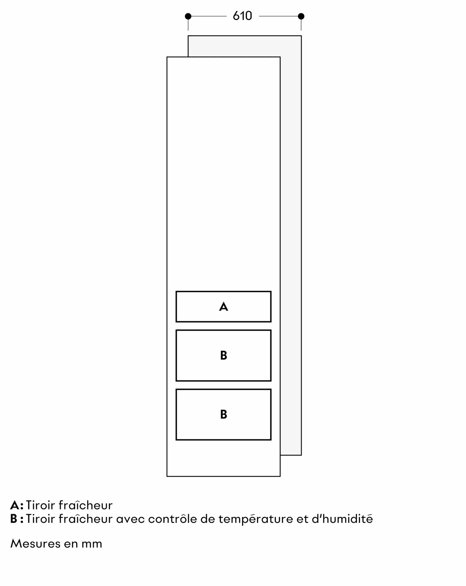 Les tiroirs dans RVC et RVF sont placés à la même hauteur. Dans le cas d’une installation en side-by-side, les tablettes en verre et les balconnets de contre-porte peuvent être alignés au même niveau