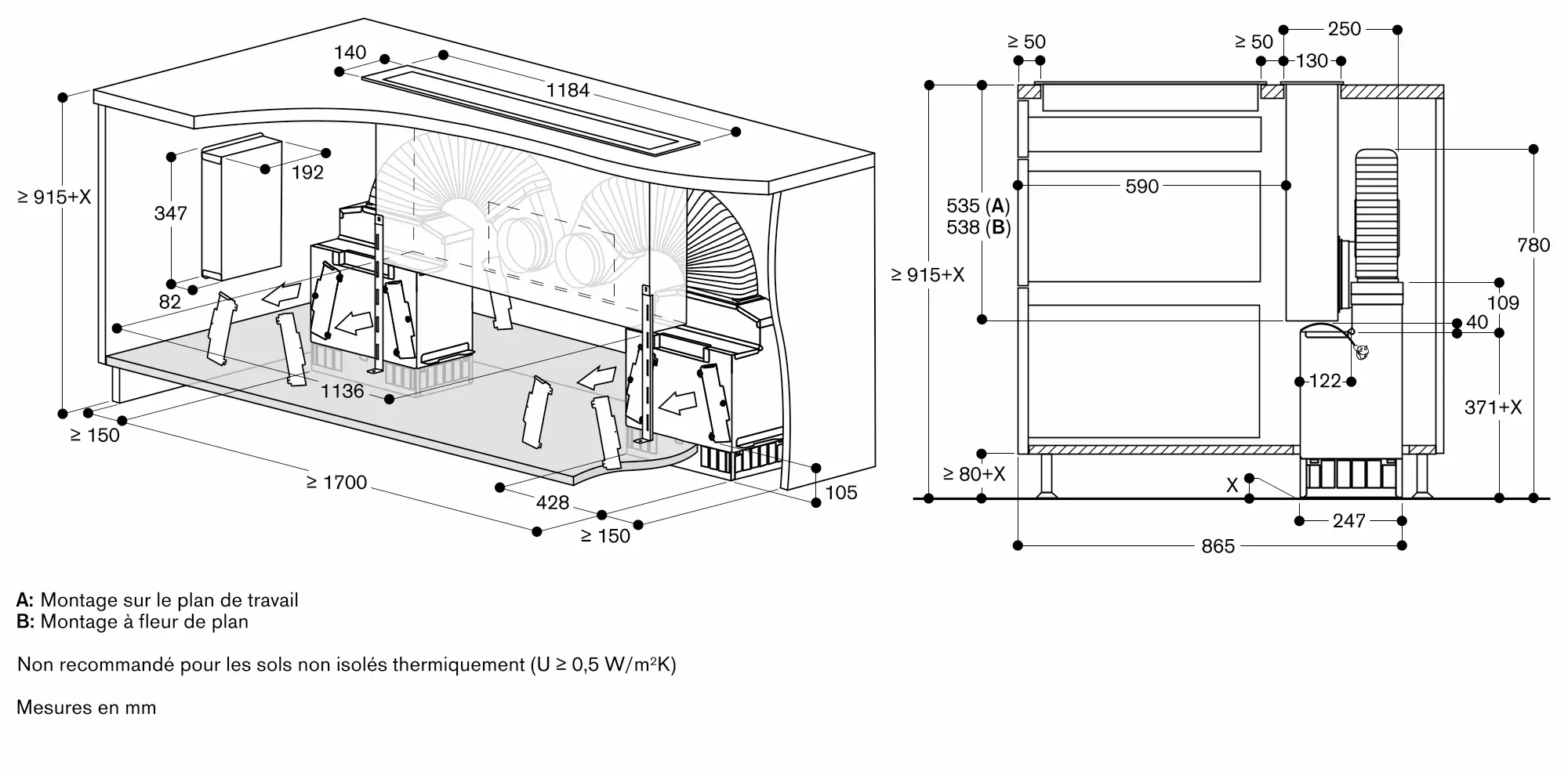 La hotte de plan de travail doit être installée dans une découpe séparée dans le plan de travail.