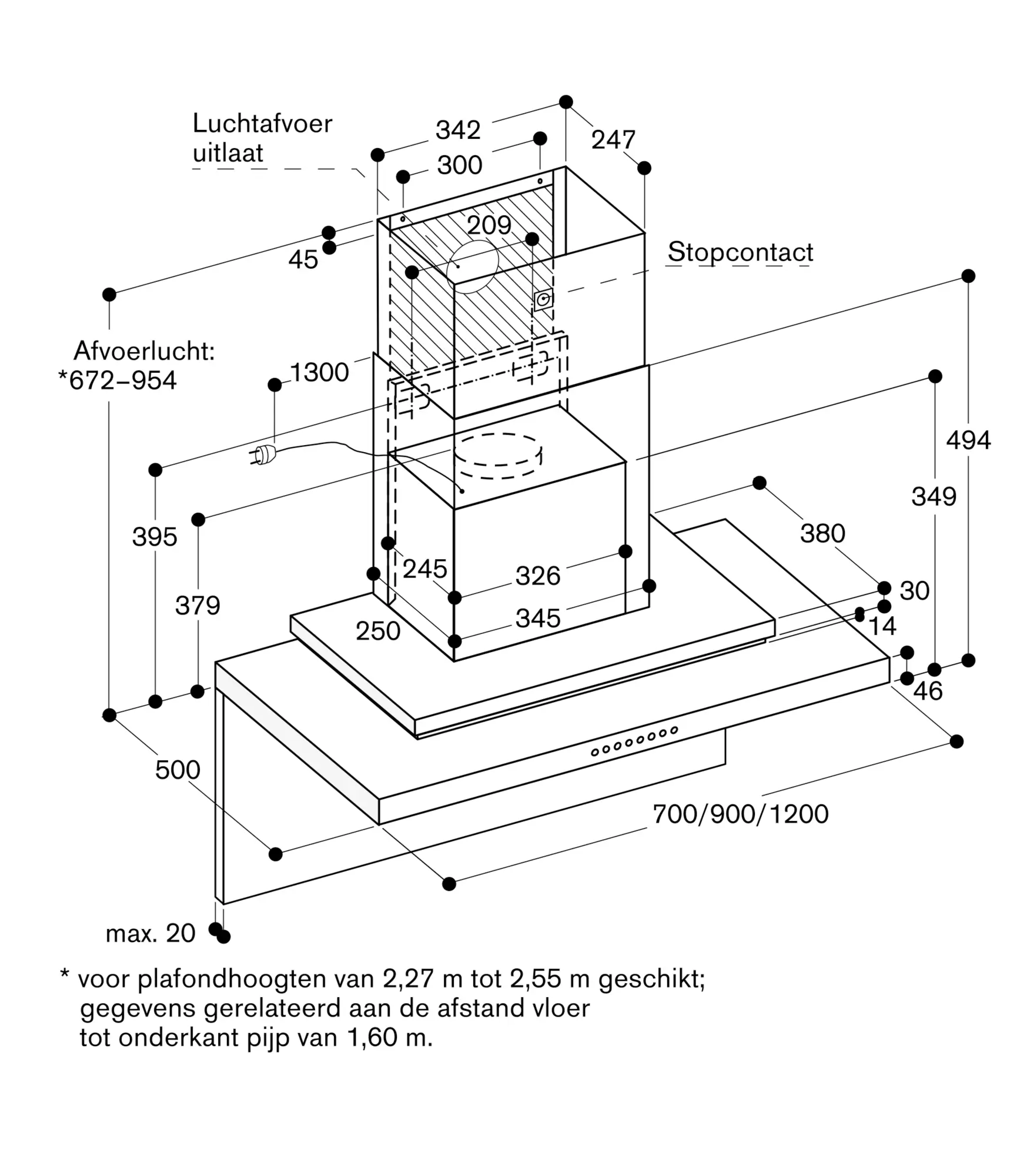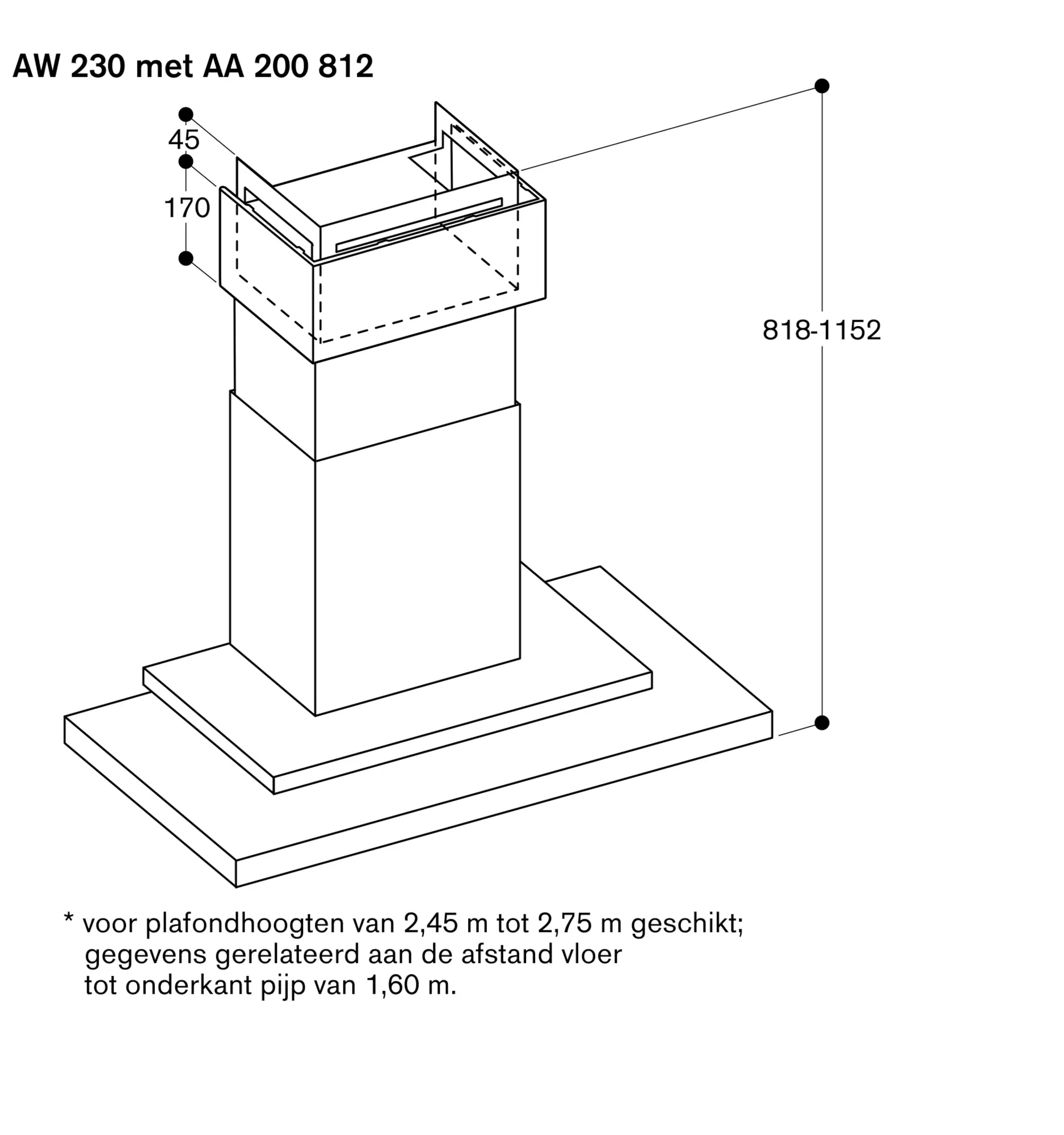 Minimale afstand boven gaskookplaat: 65 cm (minstens 70 cm indien het totale vermogen meer dan 12 kW is).