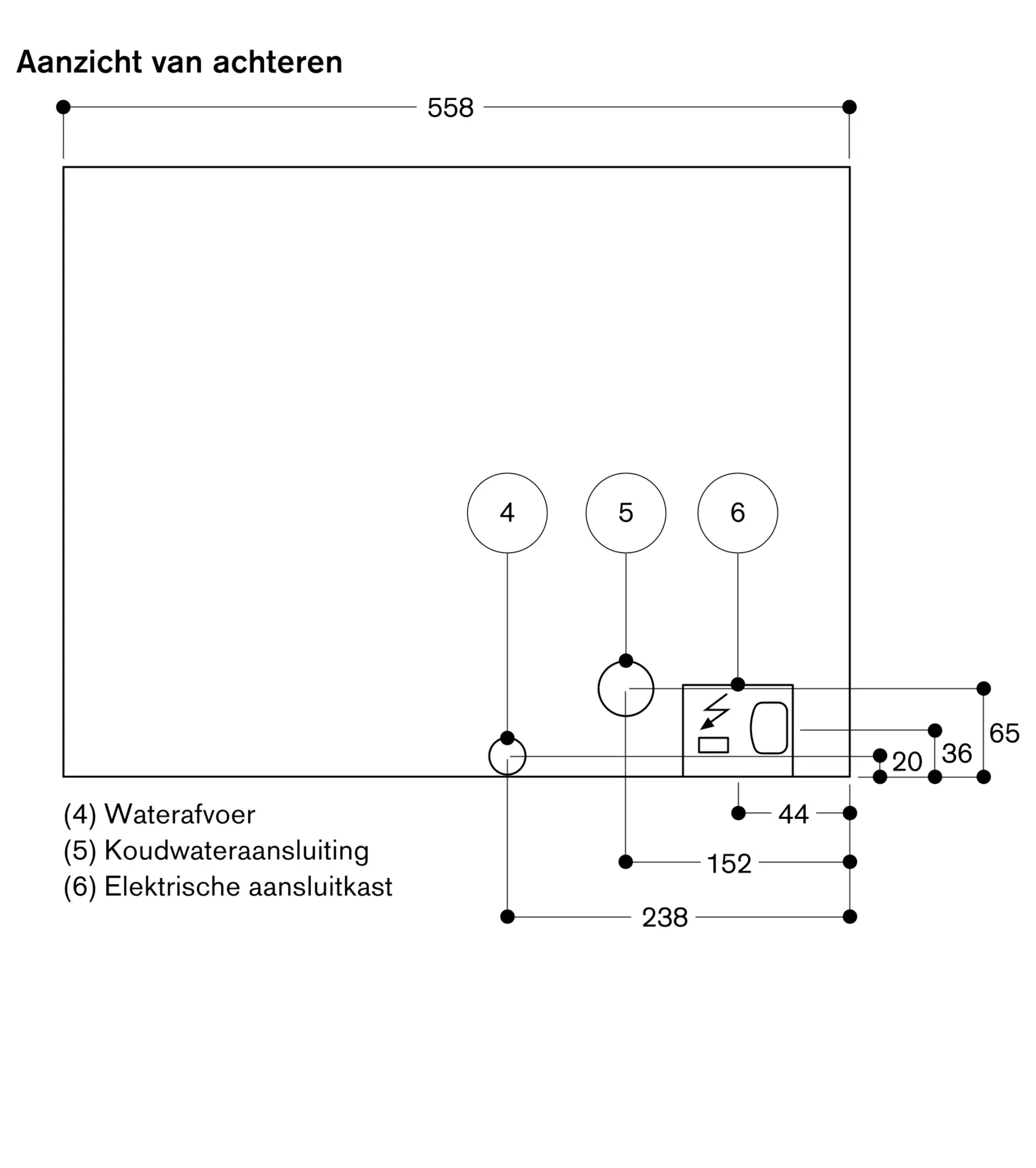 Wateraansluiting (1) voor de toevoerslang moet steeds toegankelijk zijn, mag zich niet achter het toestel bevinden.