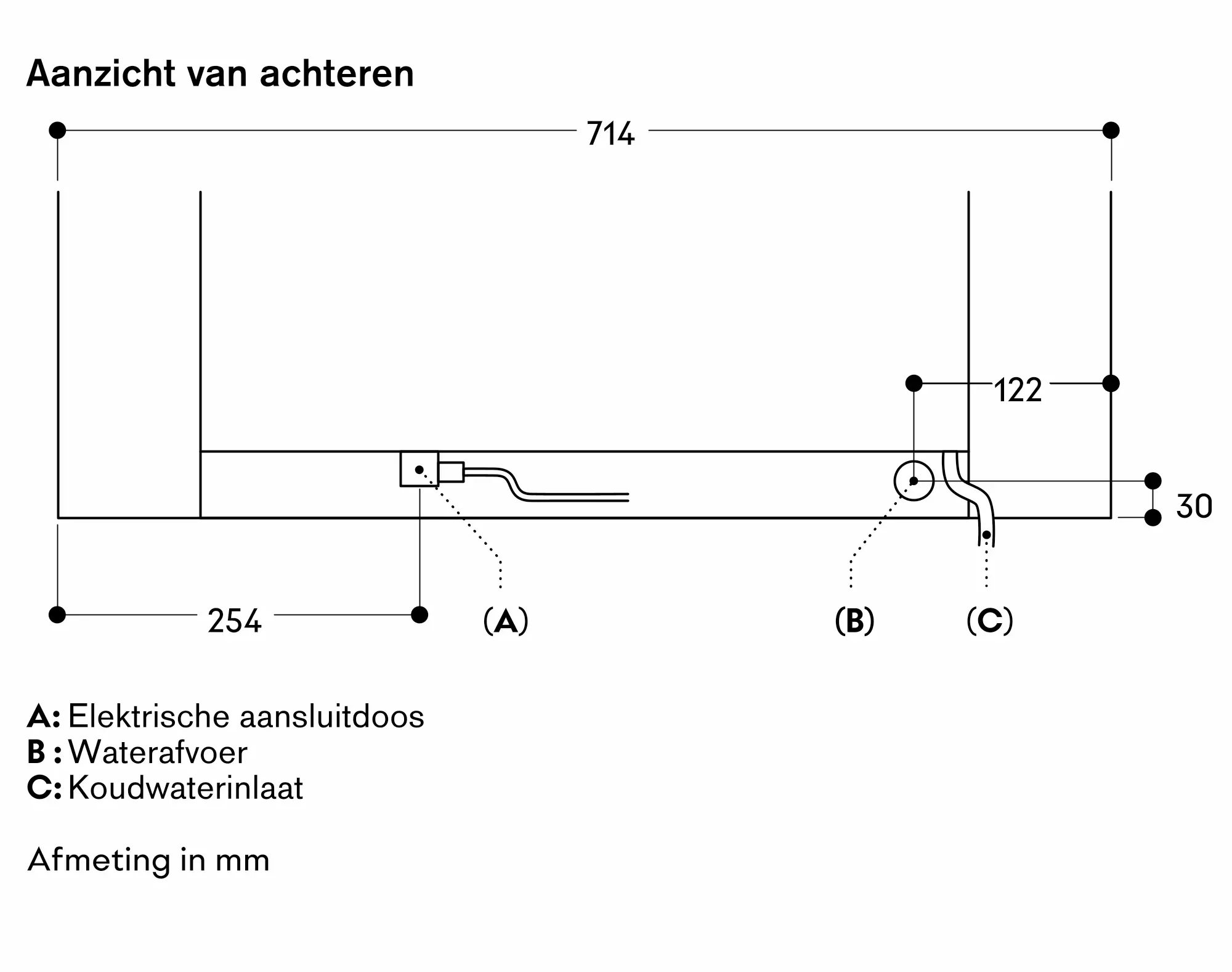 Wateraansluiting voor de toevoerslang moet steeds toegankelijk zijn, mag zich niet achter het toestel bevinden.