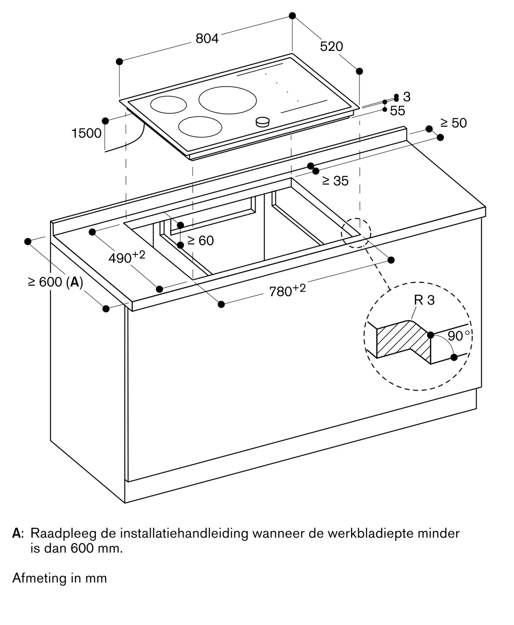 Installatie is mogelijk in werkbladen van steen, kunststof of hout. Hittebestendige en waterdichte afdichting is nodig. Met betrekking tot andere materialen raadpleeg de werkbladfabrikant.