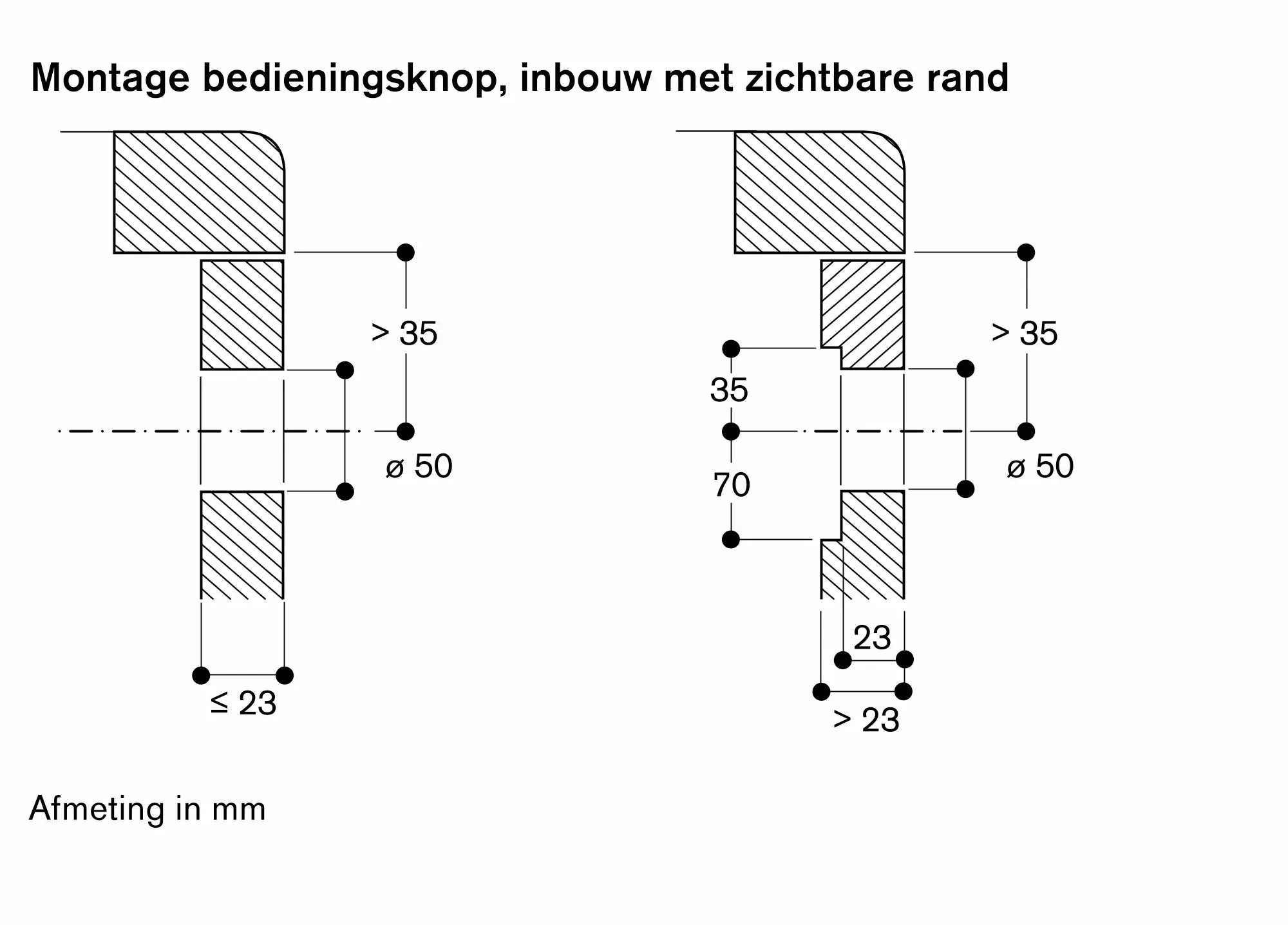 Afhankelijk van het type installatie (opbouw of inbouw, met of zonder afdekplaat), kan de nis en de locatie van de knop variëren.