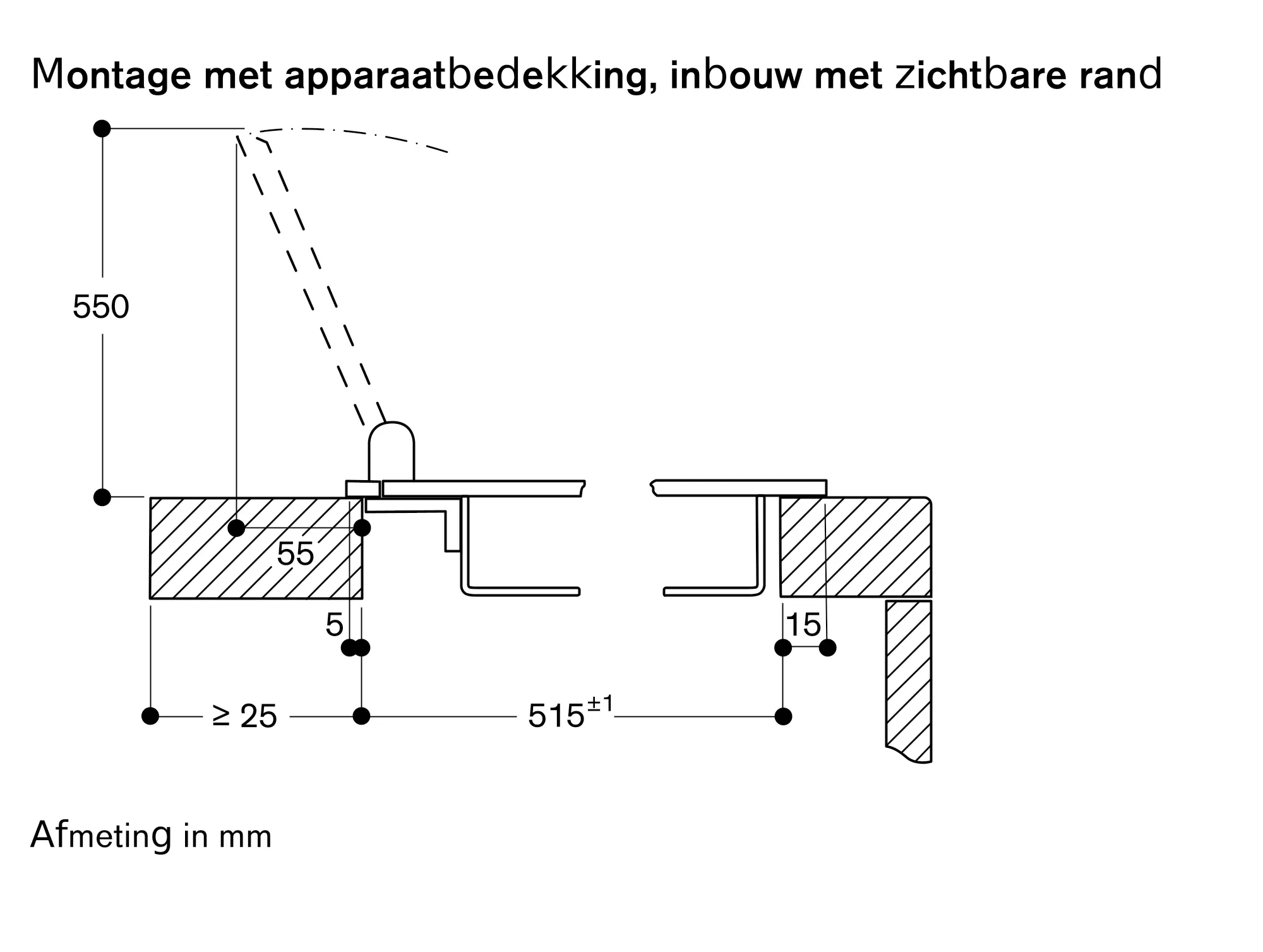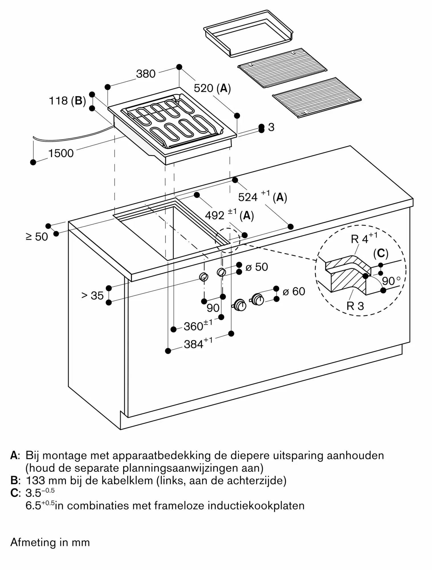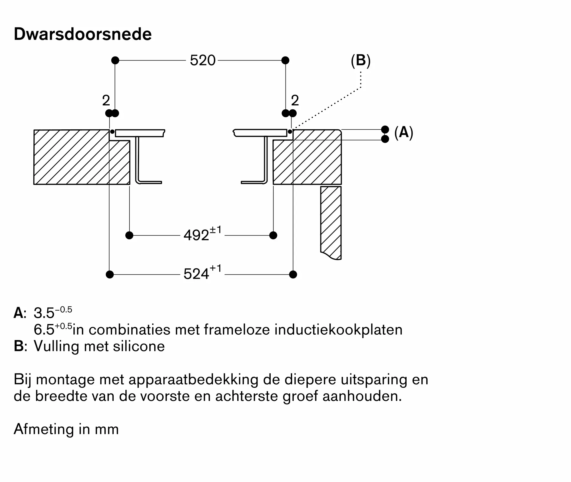 Installatie is mogelijk in werkbladen van steen, kunststof of hout. Hittebestendige en waterdichte afdichting is nodig. Met betrekking tot andere materialen raadpleeg de werkbladfabrikant.
