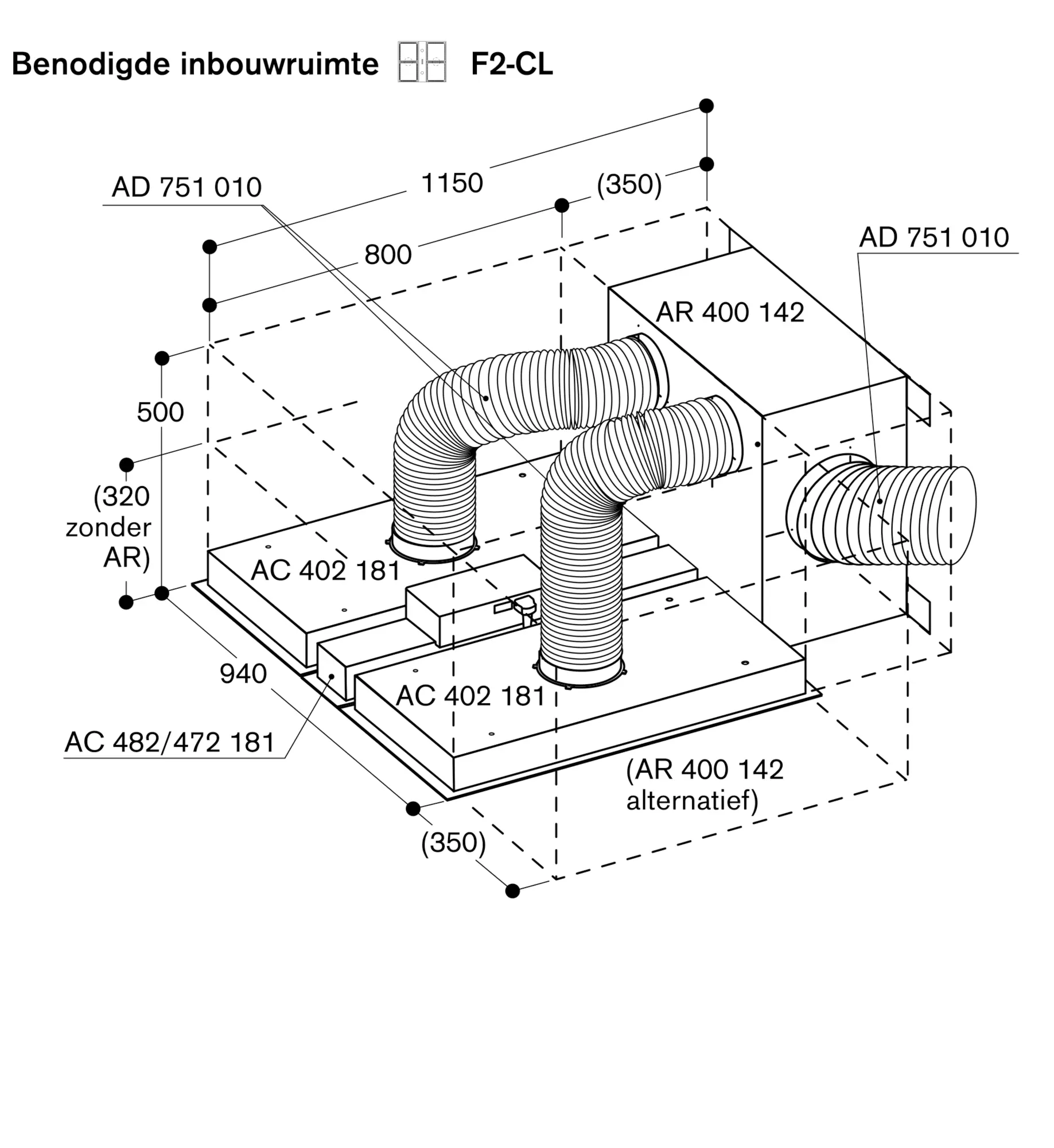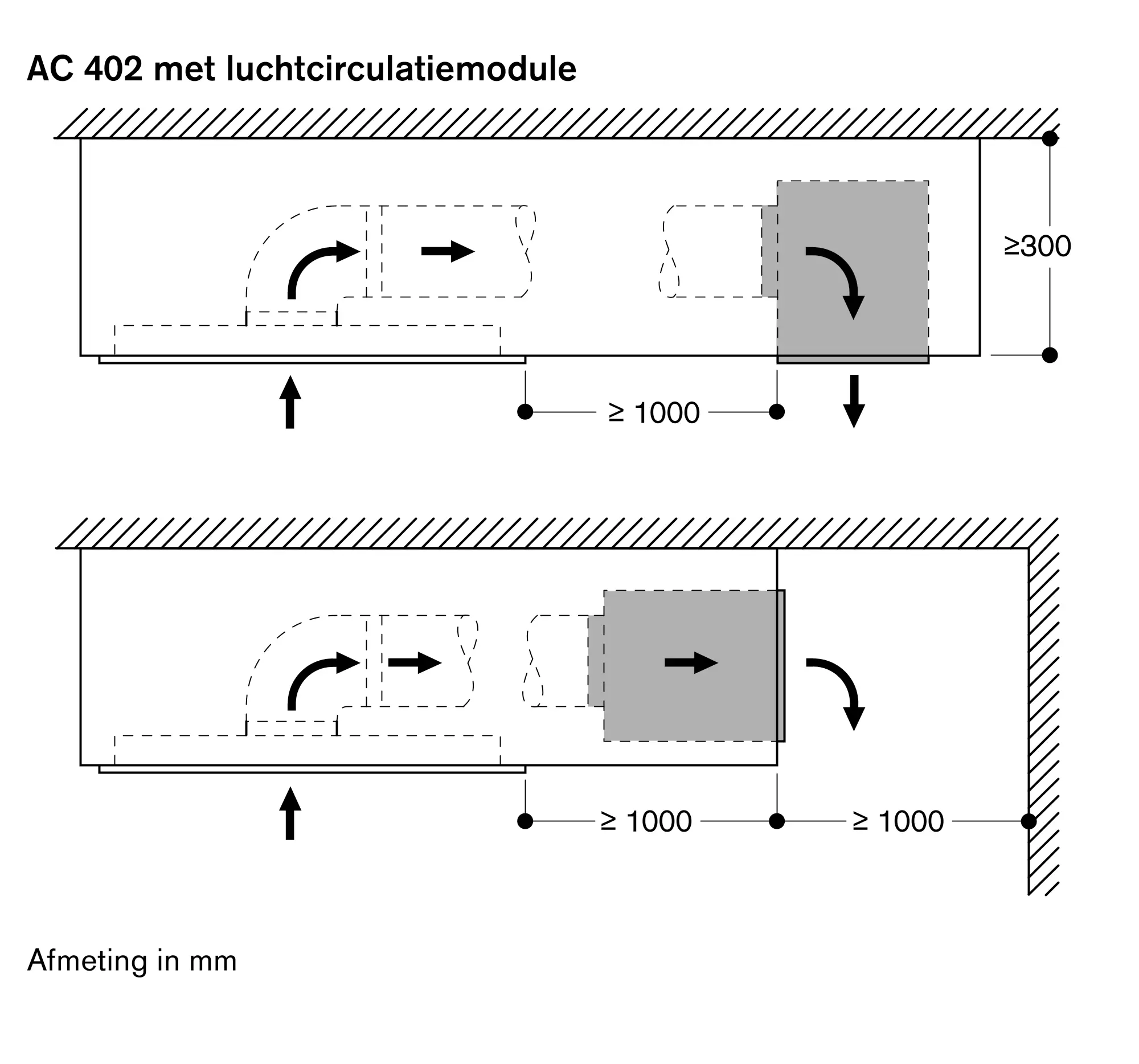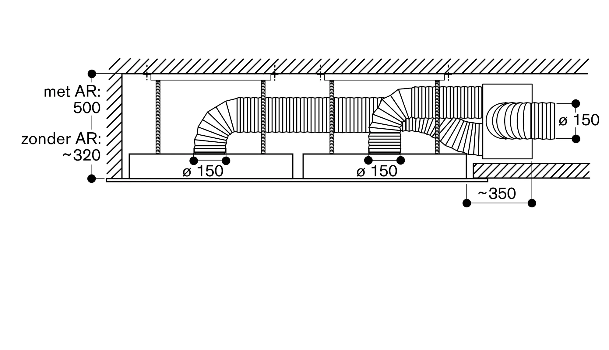 Zie pagina xxx voor aanbevolen configuraties van de afzuiggroep, de onafhankelijke motor en de daaruit voortvloeiende afmetingen.