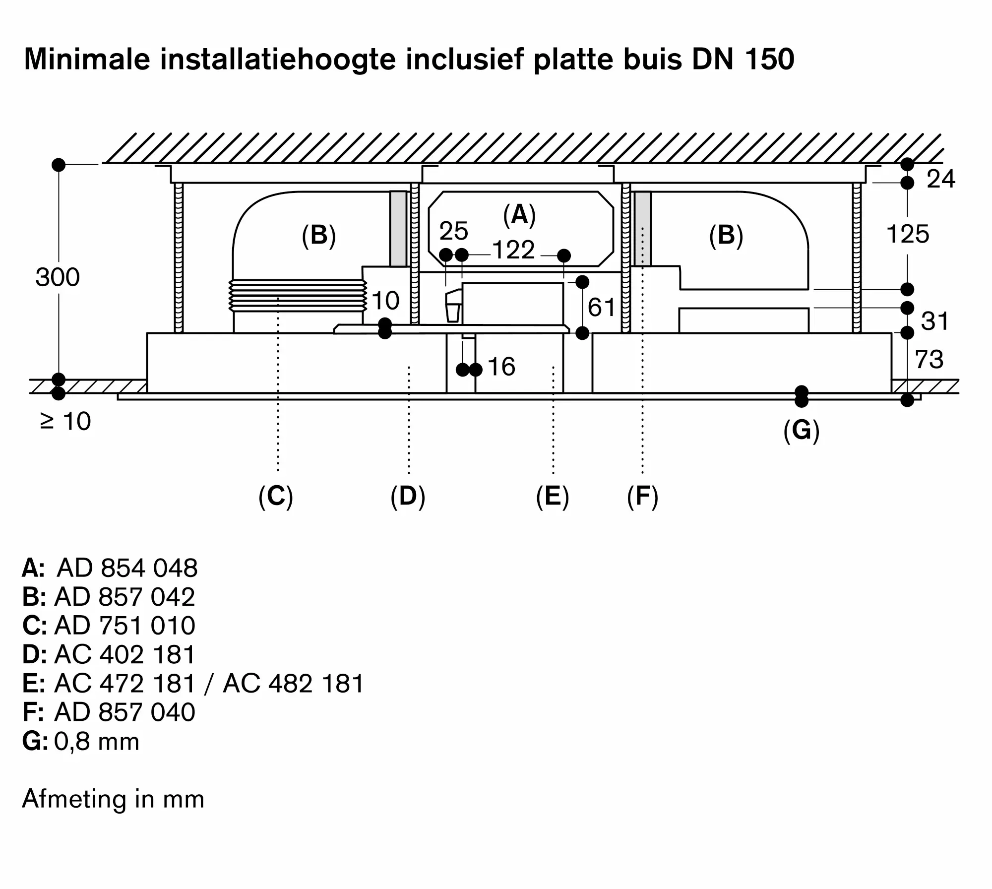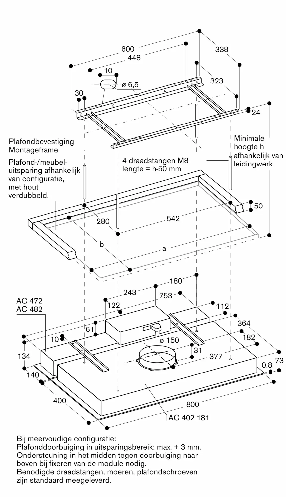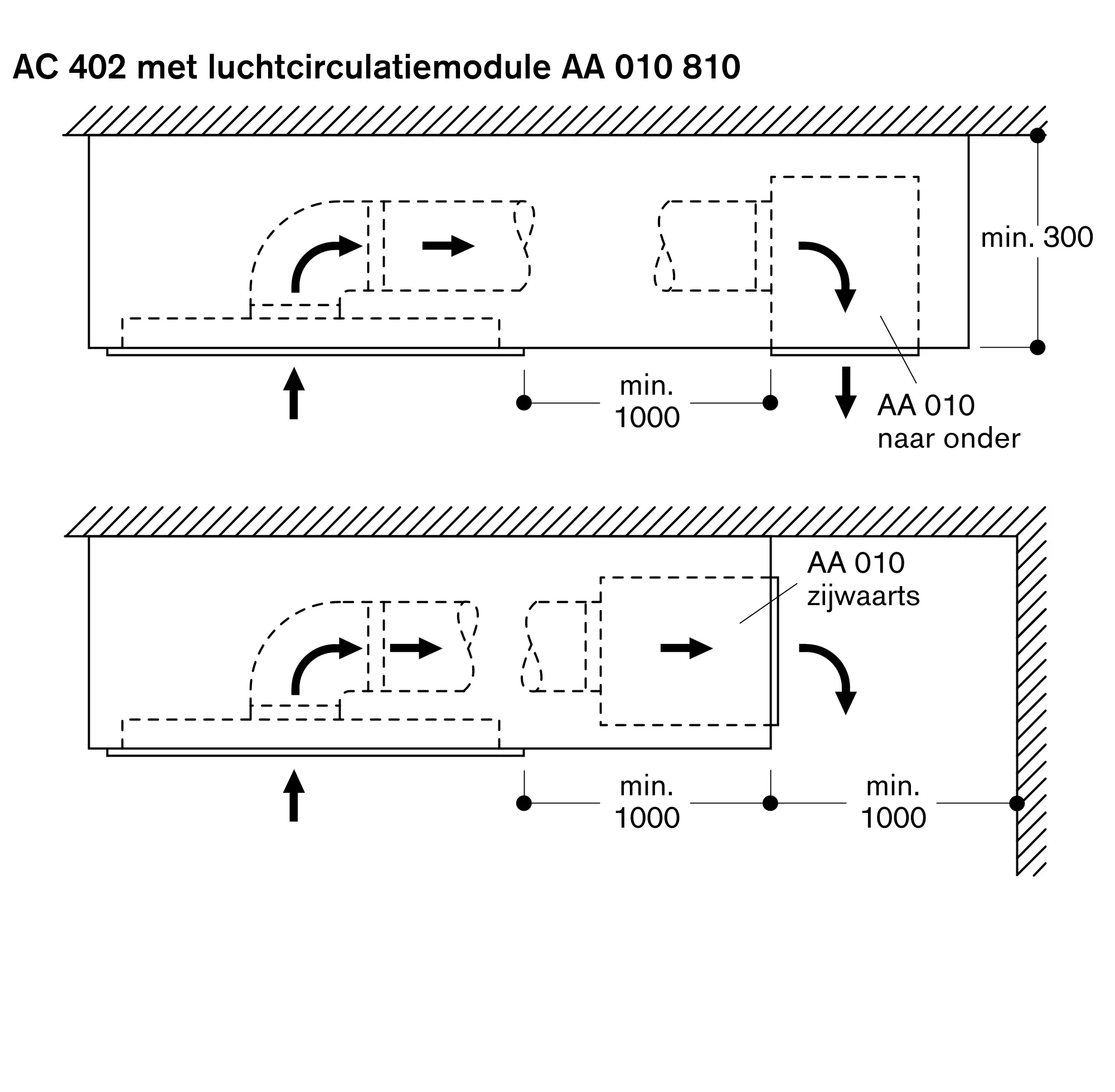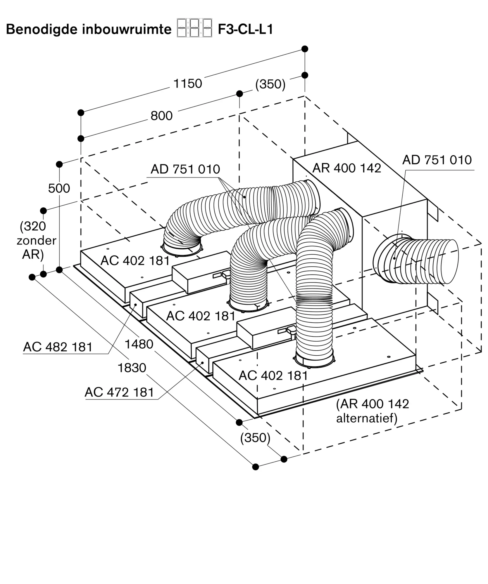 Zie pagina xxx voor aanbevolen configuraties van de afzuiggroep, de onafhankelijke motor en de daaruit voortvloeiende afmetingen.
