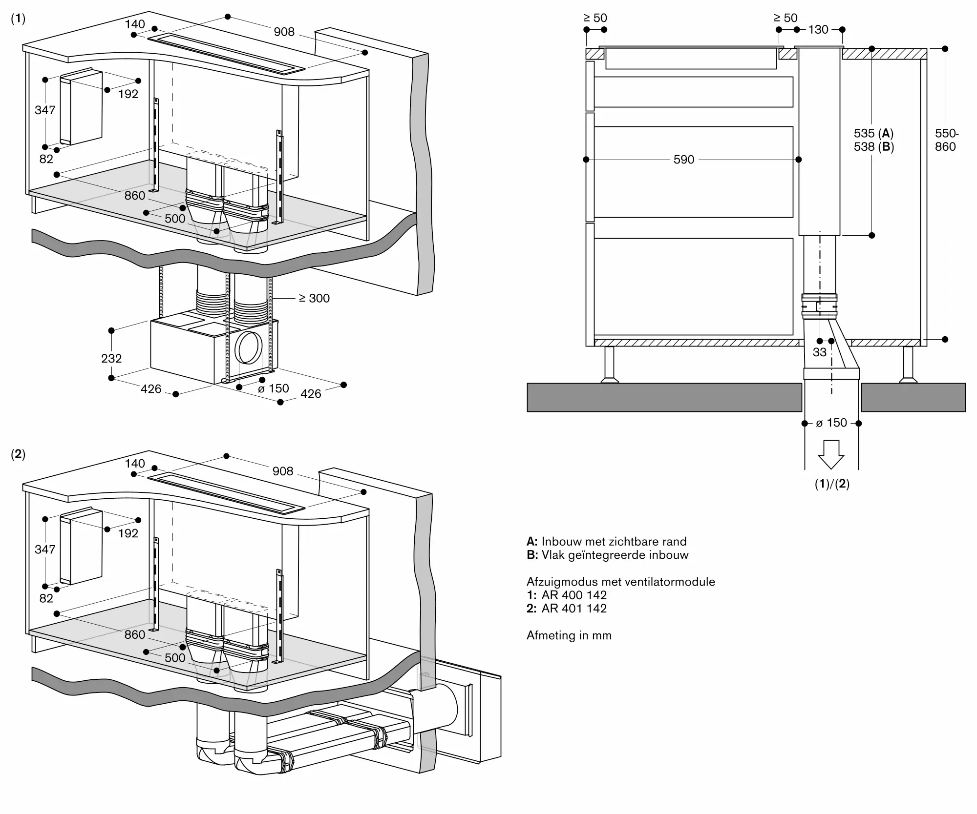 De tafelventilatie moet een eigen werkbladuitsparing hebben.