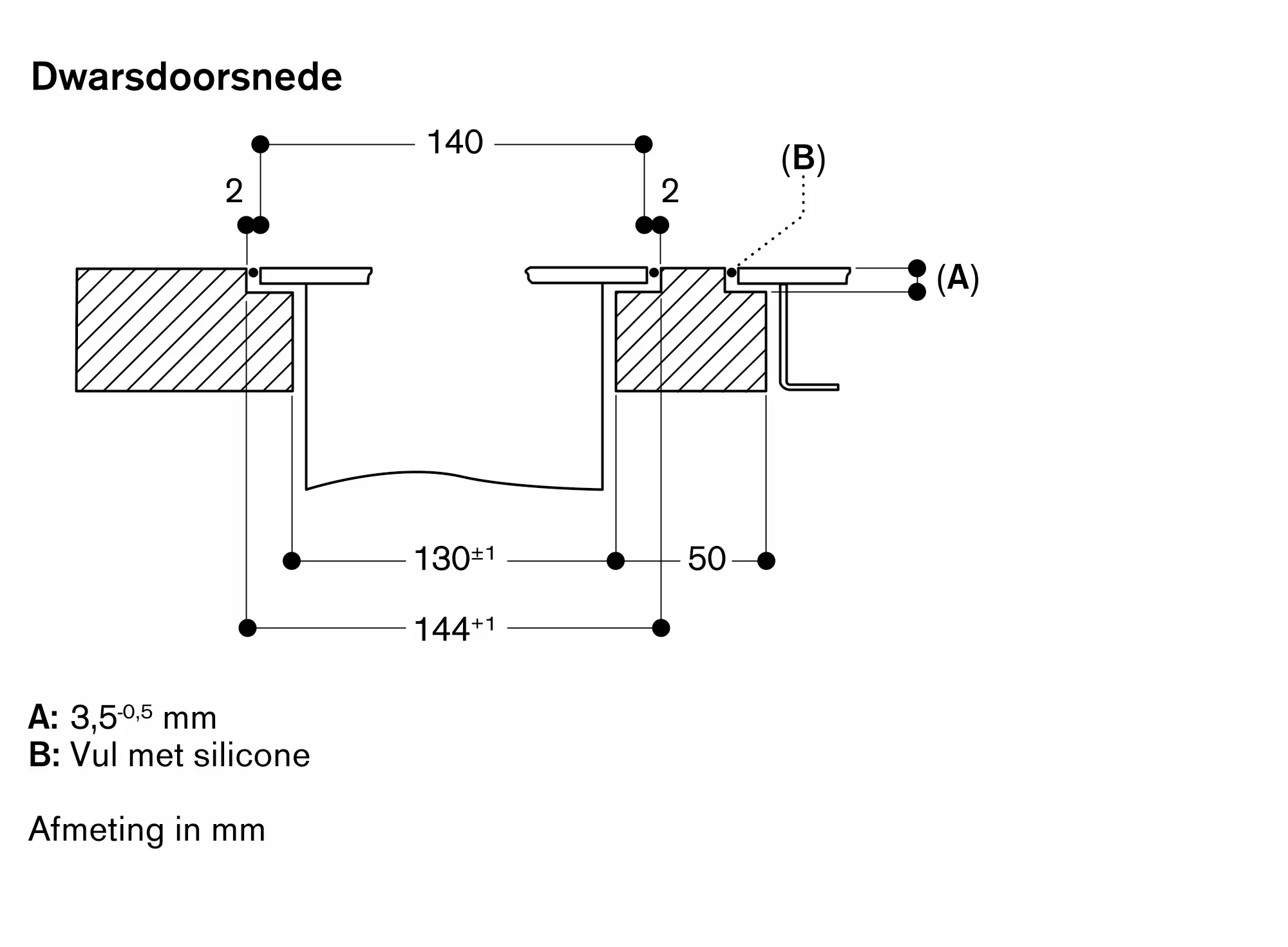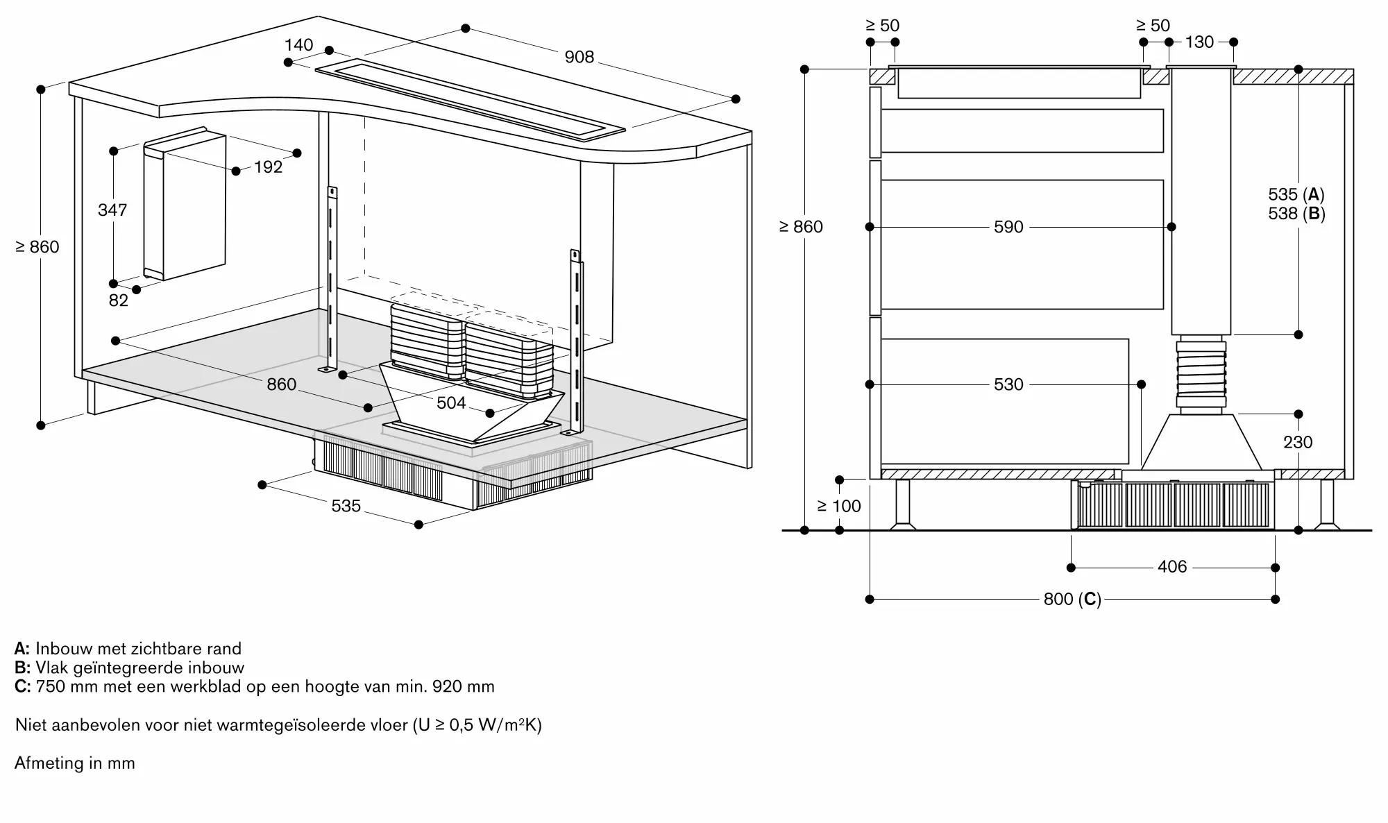 Installatie is mogelijk in werkbladen van steen, kunststof of hout. Hittebestendige en waterdichte afdichting is nodig. Met betrekking tot andere materialen raadpleeg de werkbladfabrikant.