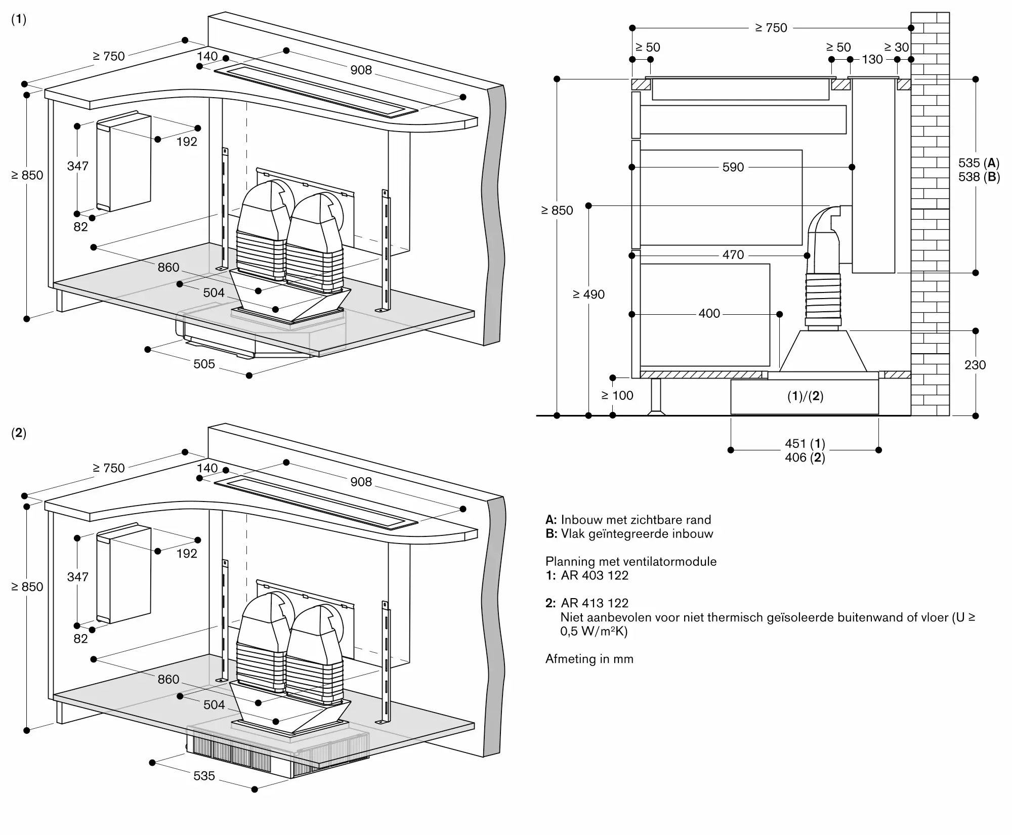 Voor een optimale prestatie in recyclage-werking wordt een luchtuitlaat-oppervlak van min. 440 cm² aanbevolen.