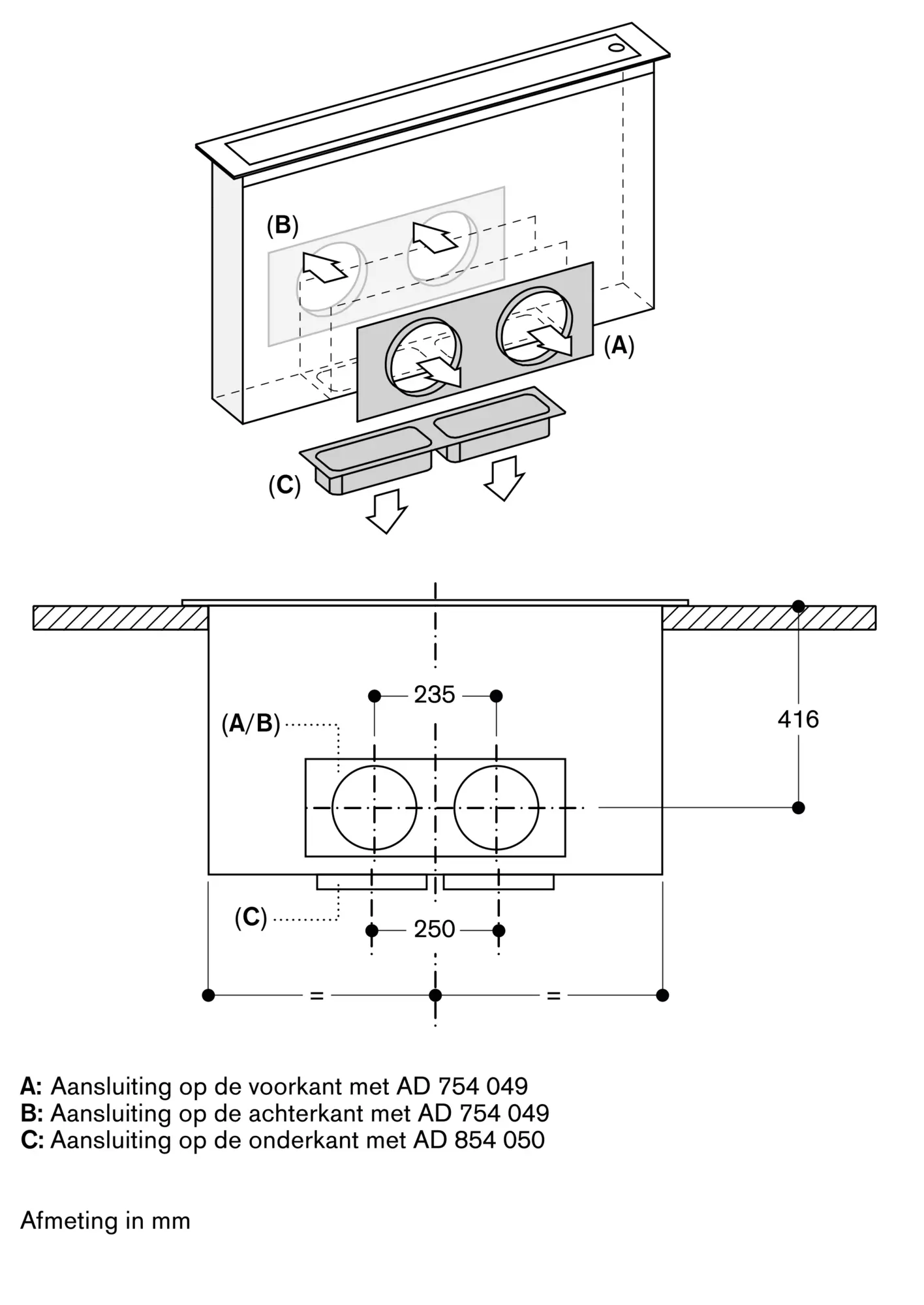 Het resterende gedeelte van het werkblad (min. 50 mm) tussen de uitsparingen moet verstevigd worden met een dwarslijst. Het is aangeraden om de meubelsteun AA 409 401/431 te gebruiken.