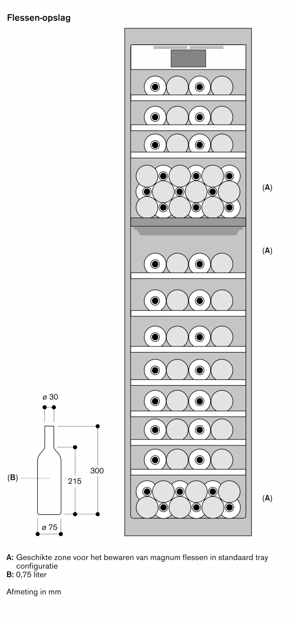 Bij standaard binnenindeling (12 flessenleggers) kunnen tot 6 Magnum flessen opgeslagen worden.
