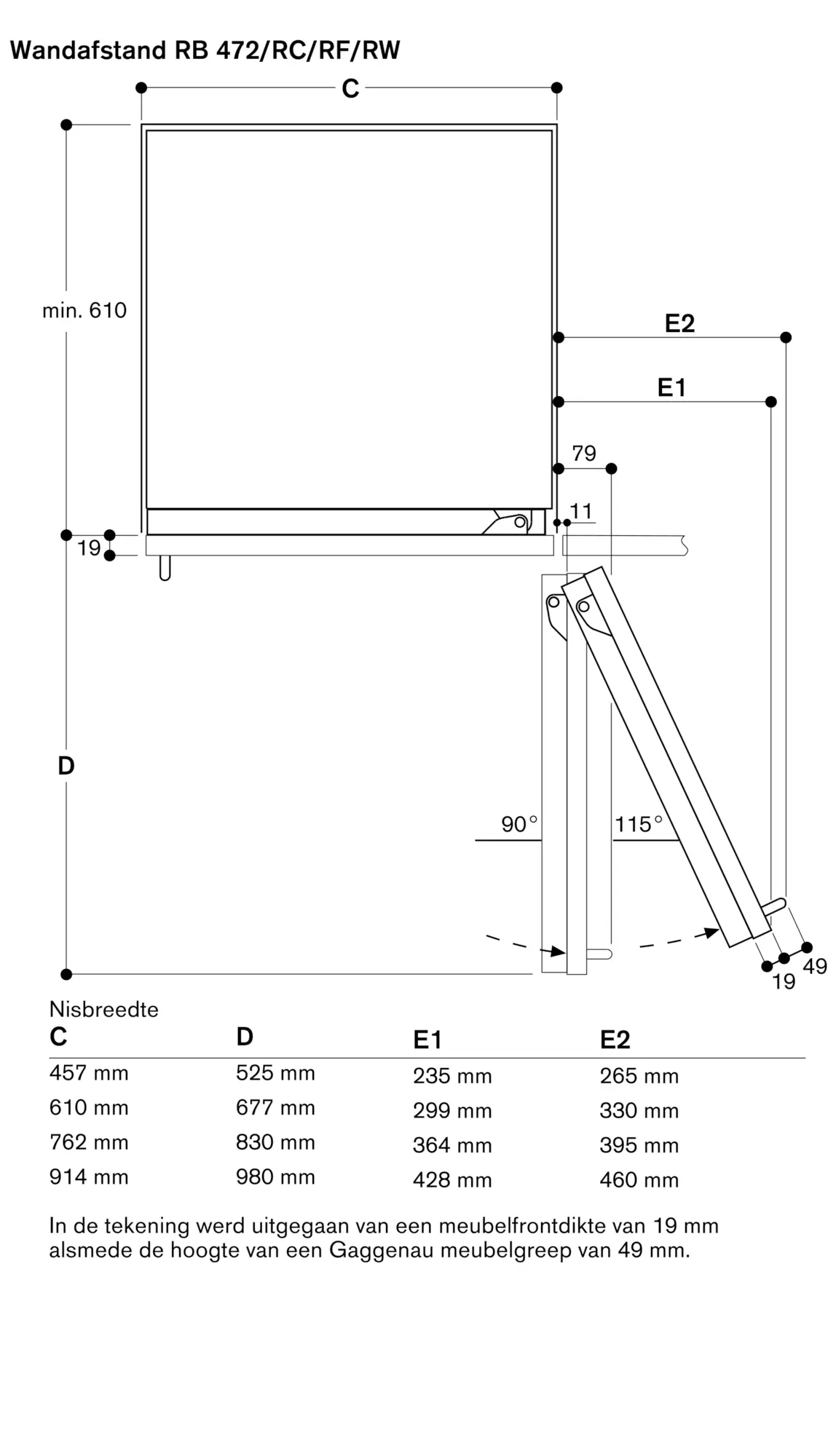 Deuropeningshoek 115°, kan op 90° vergrendeld worden.