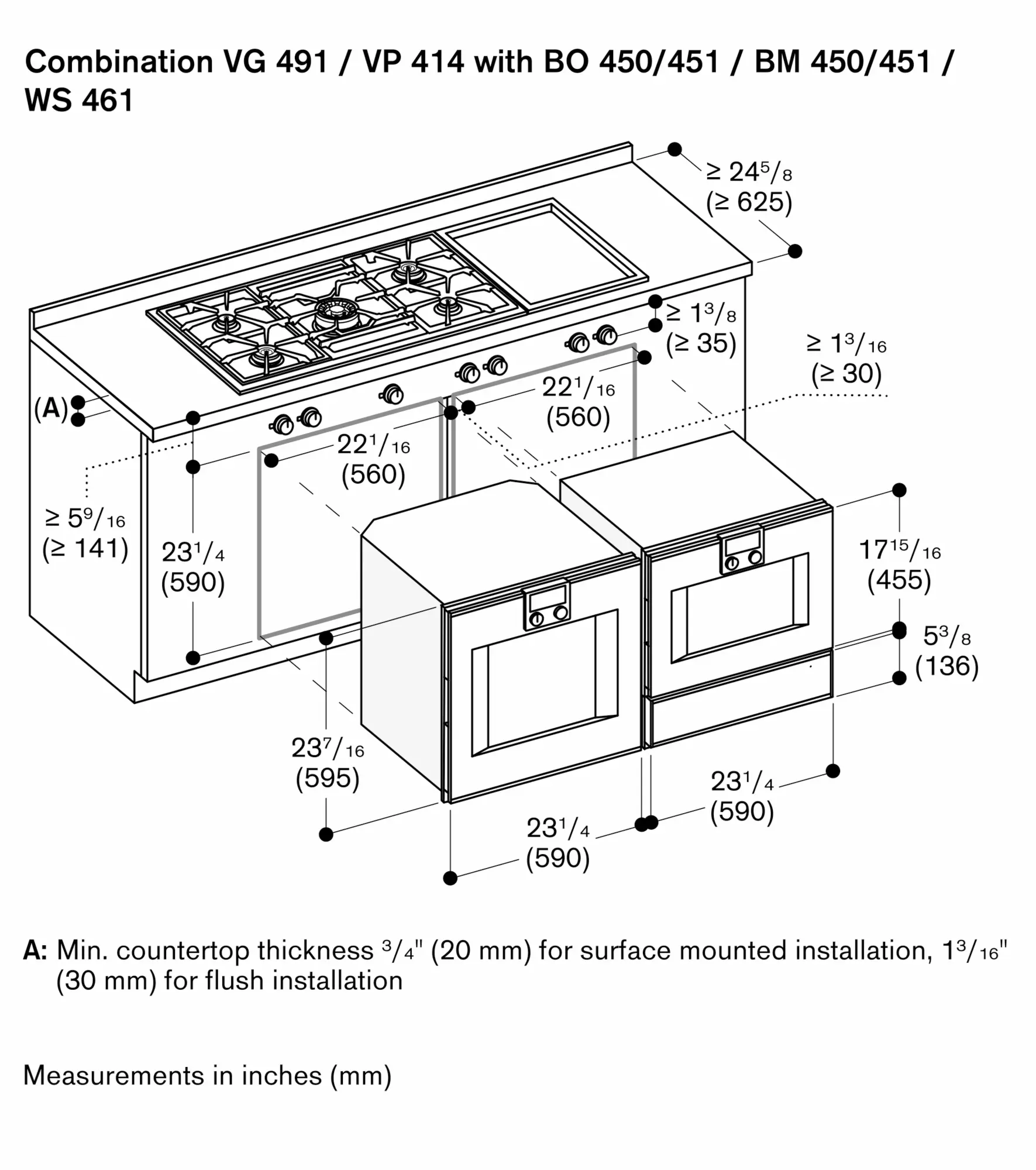 Flush installation is possible in countertops made of stone, synthetics or solid wood. Heat resistance and watertight sealing of the edges must be observed. For other materials, please consult with your countertop manufacturer.