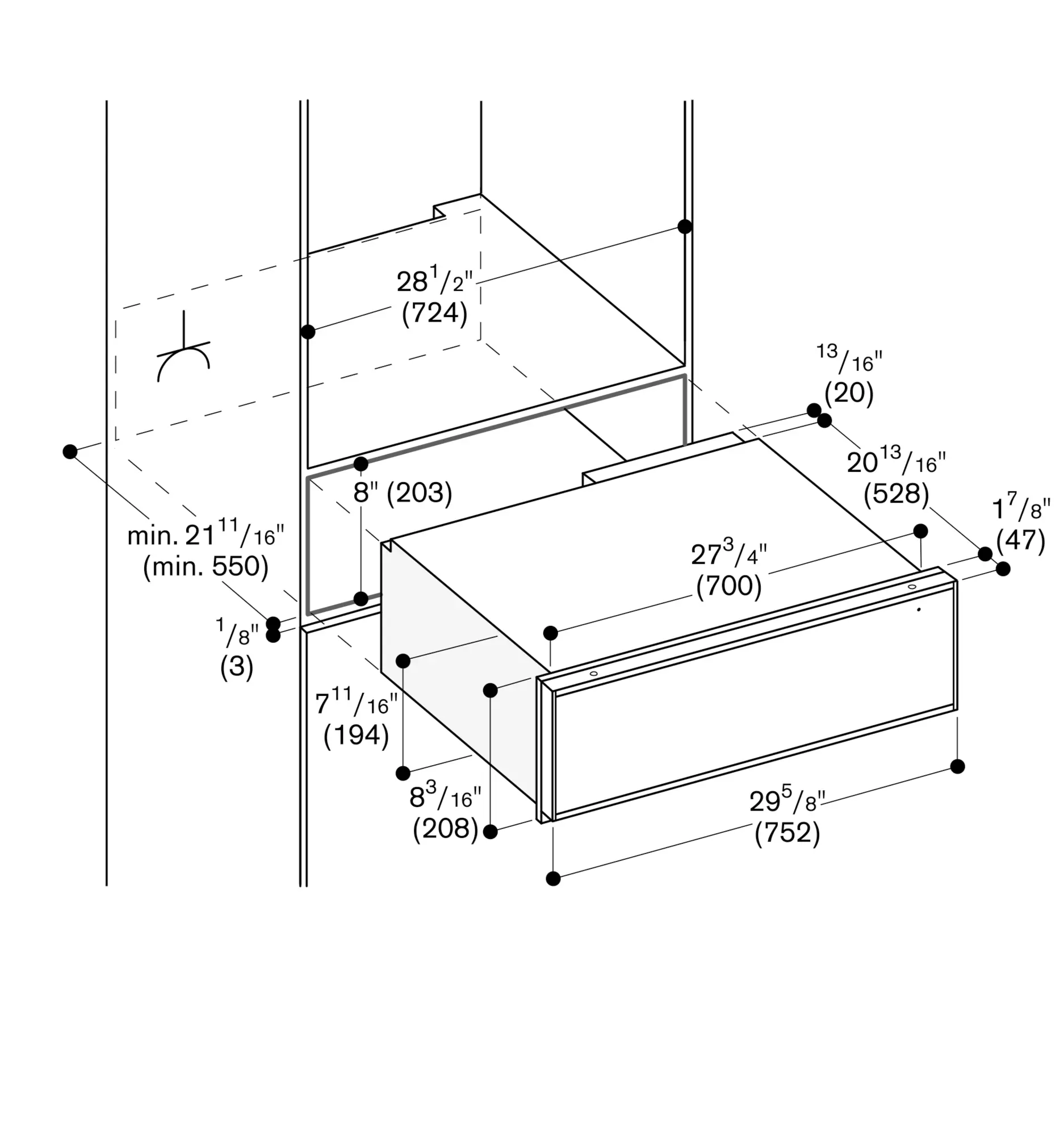 Recessed grip at the front bottom of the drawer.
