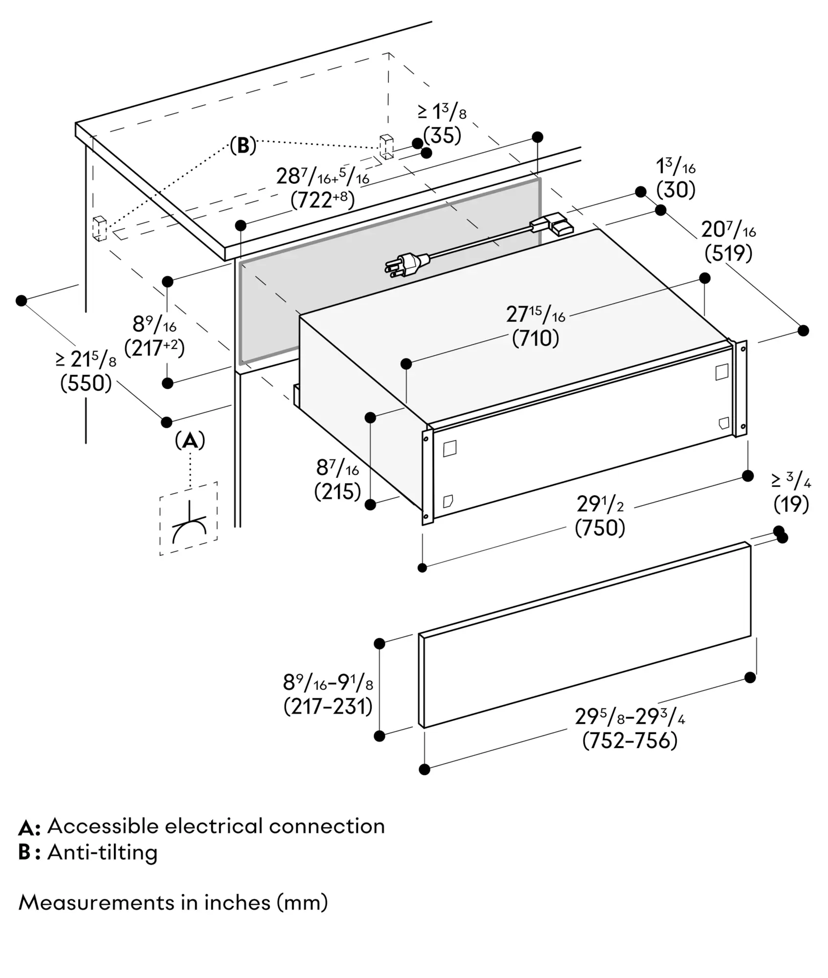 Installation of GO/GS/GM/GC directly above the drawer without intermediate shelf.