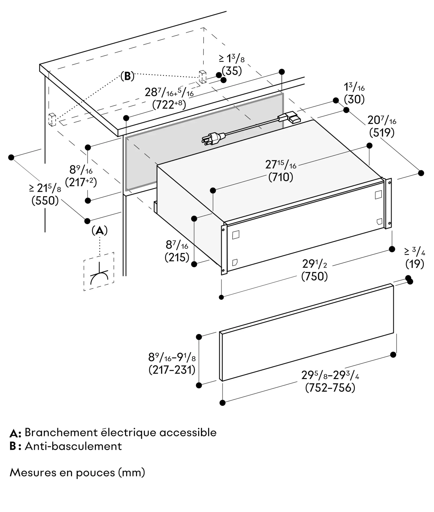 Espace latéral nécessaire entre l’avant de l’appareil et le panneau de mobilier de min. 5 mm.