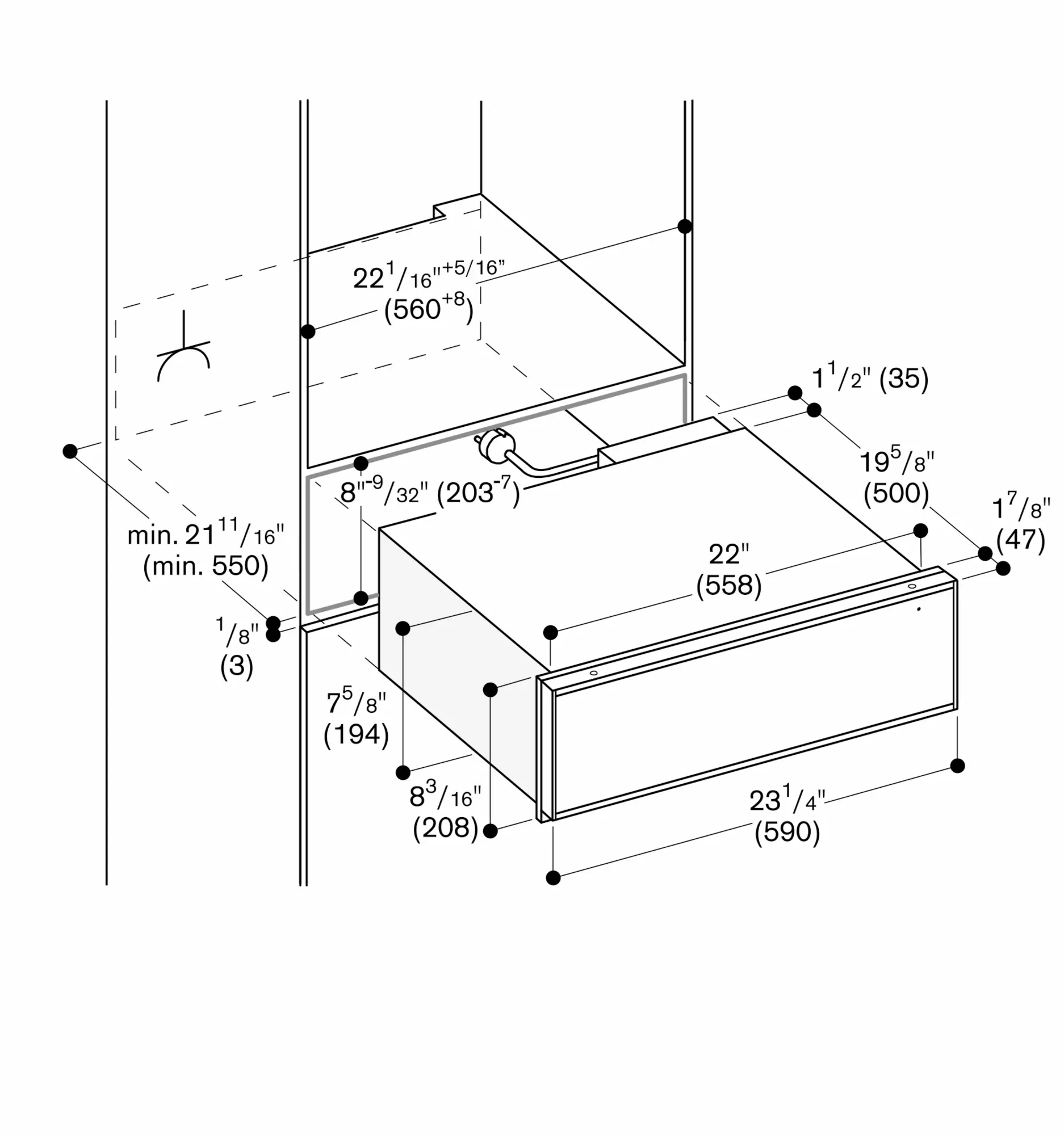 La surface du panneau de l’appareil s’étend à 47 mm de la cavité du meuble.