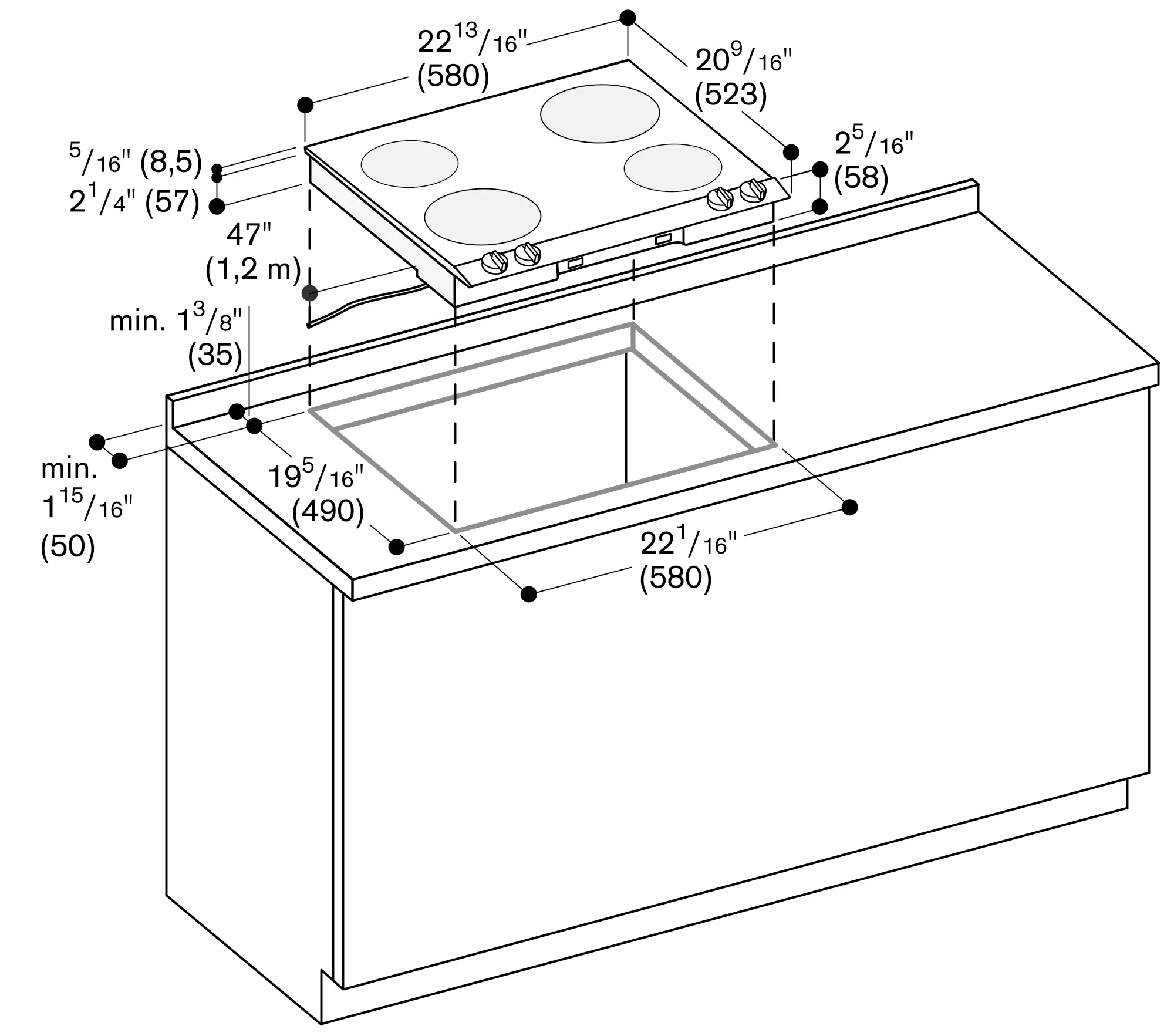 Encastrement dans un meuble de largeur minimale 60 cm.
