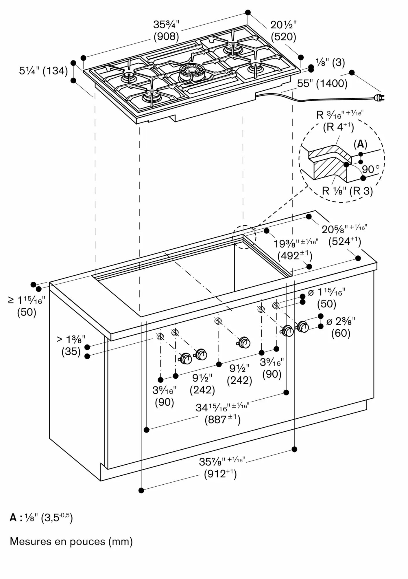 La largeur du raccord peut varier en raison des écarts de dimensions des combinaisons et de la niche de la surface de travail.