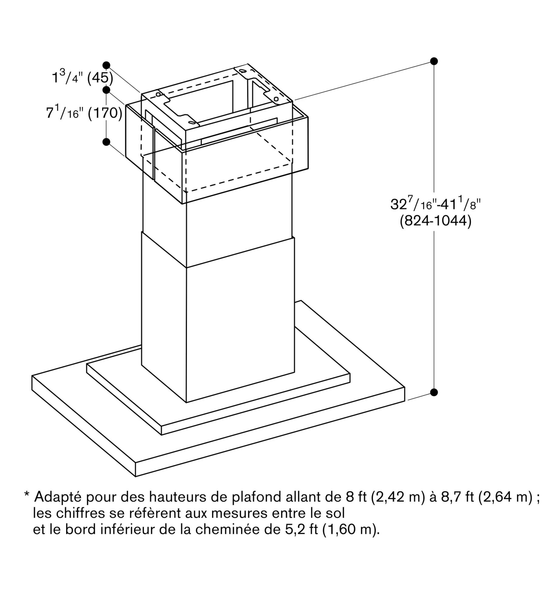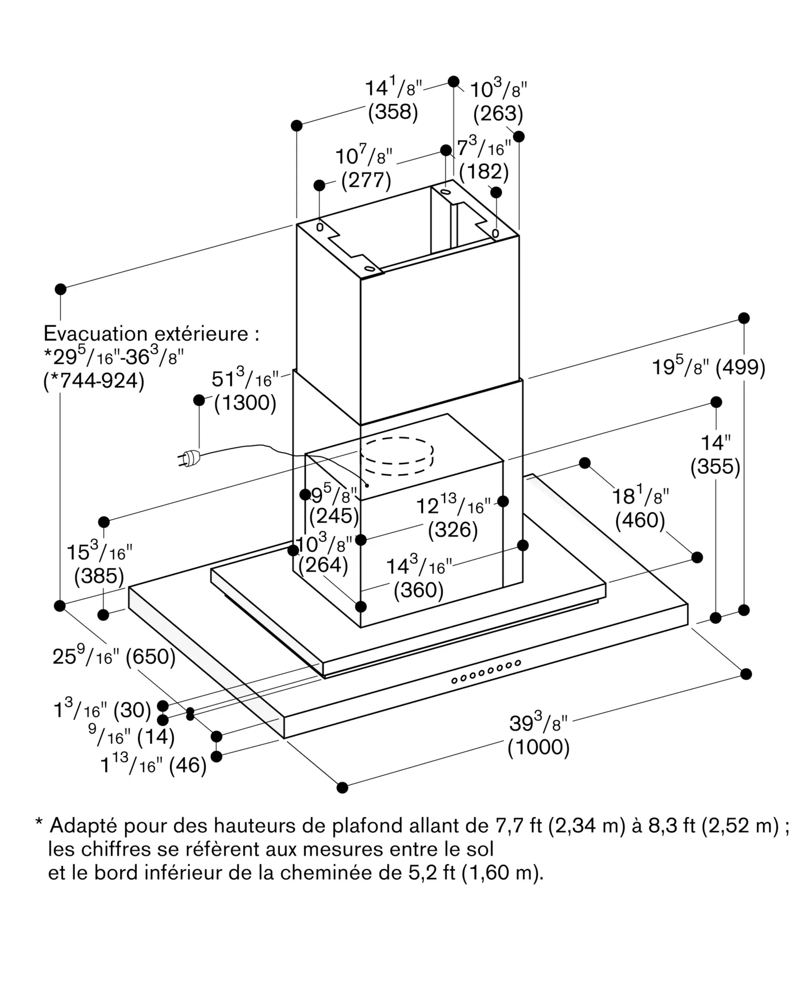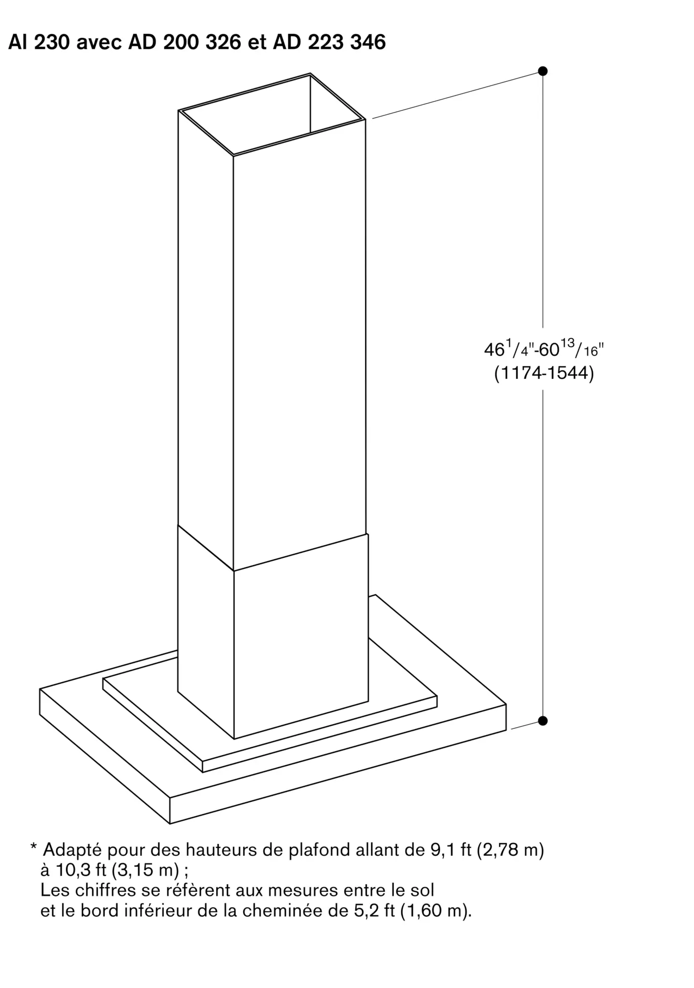 L'emballage inclut les deux sections de la cheminée dont les dimensions vont de 654 mm à 834 mm. Des solutions de planification individuelles peuvent être mises en place à l'aide de l'accessoire spécial de rallonge de la cheminée AD 200 322 ou en raccourcissant le bord inférieur de la cheminée intérieure. Des types de cheminées spéciaux sont disponibles sur demande.
