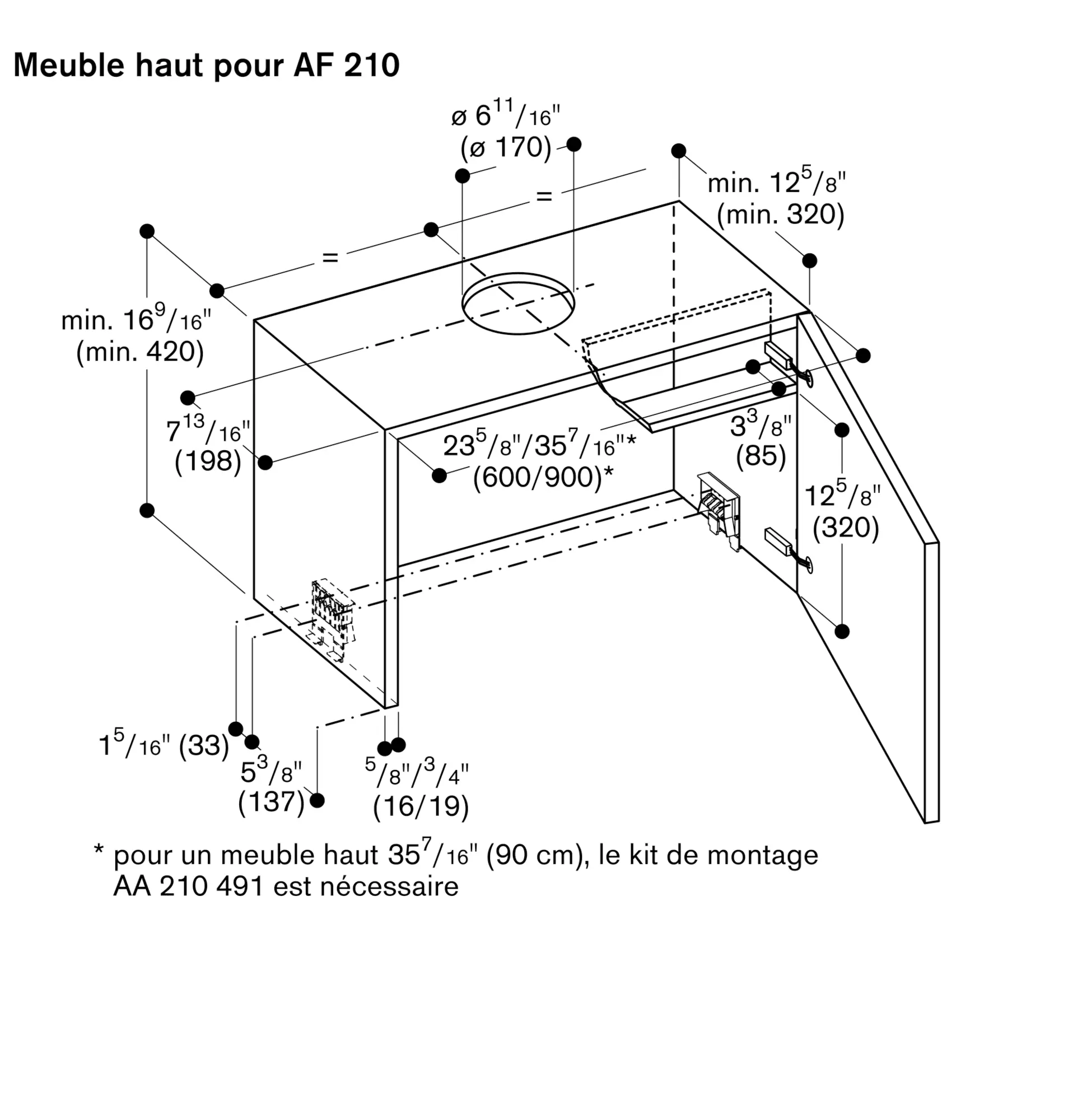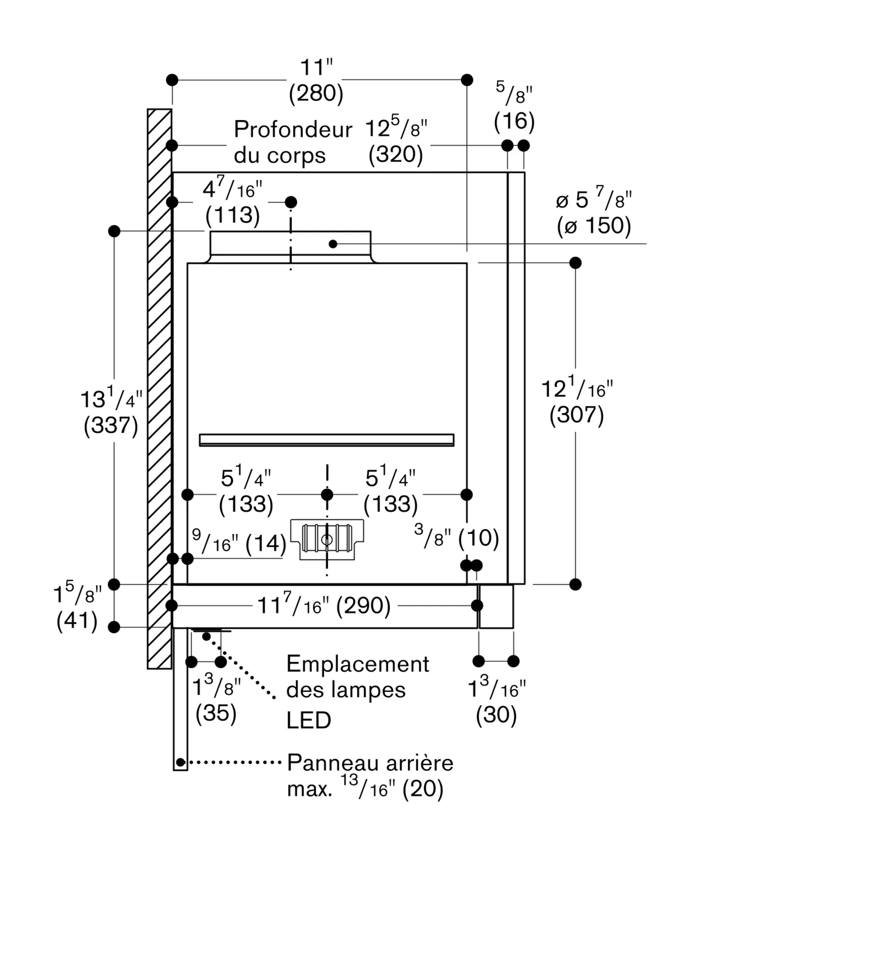 La profondeur de cavité requise de l’armoire supérieure et du cadre de descente est de 335 mm.