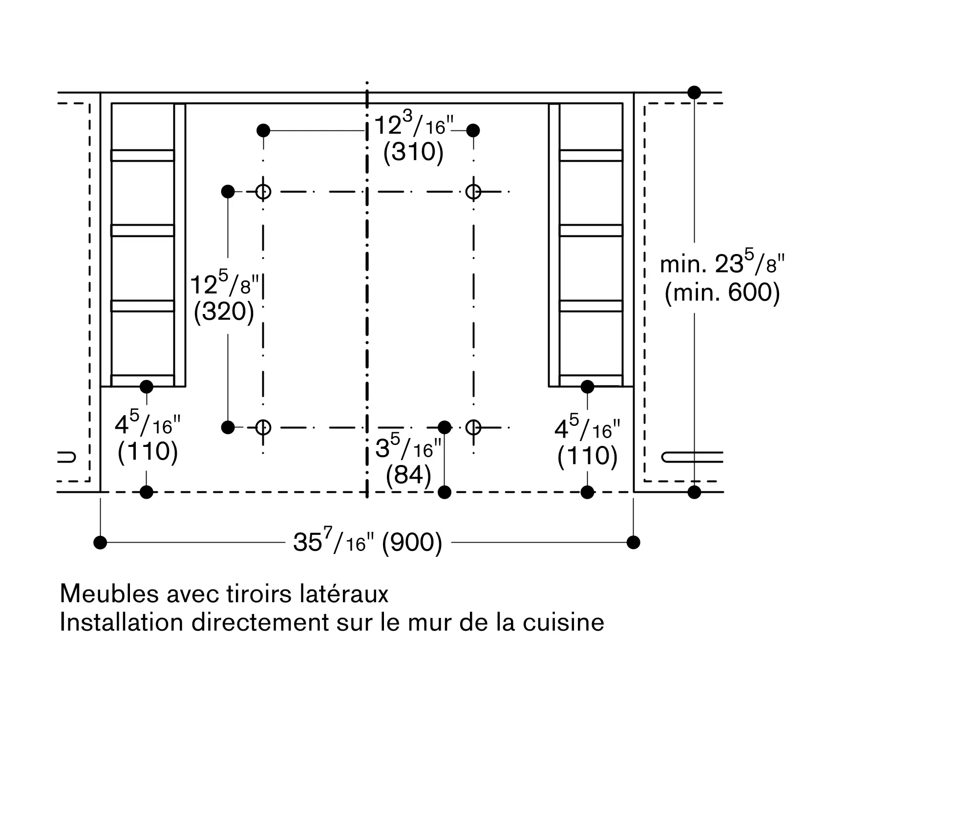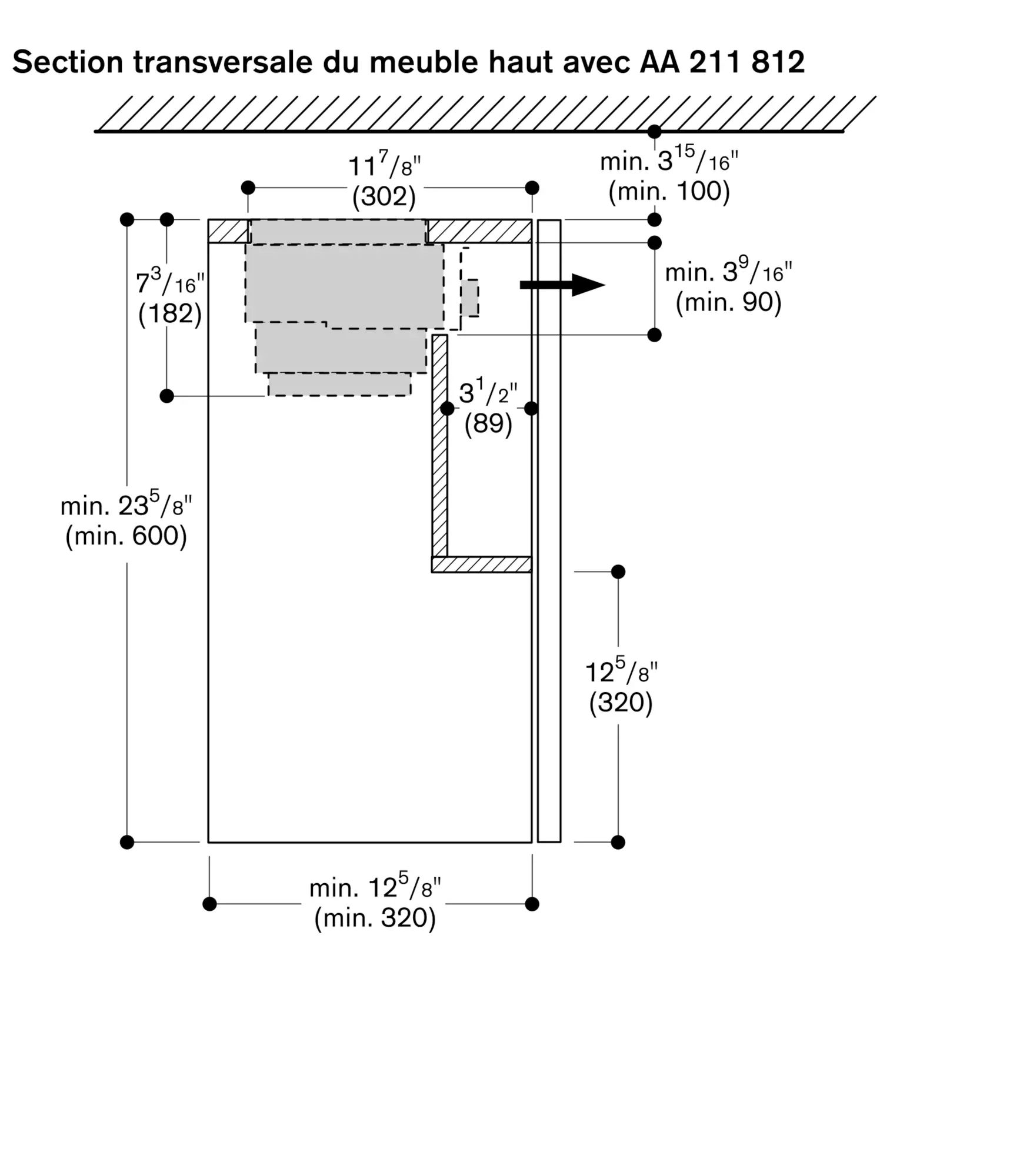 La hauteur de cavité requise de l’armoire supérieure avec le châssis d’abaissement est de 600 mm.