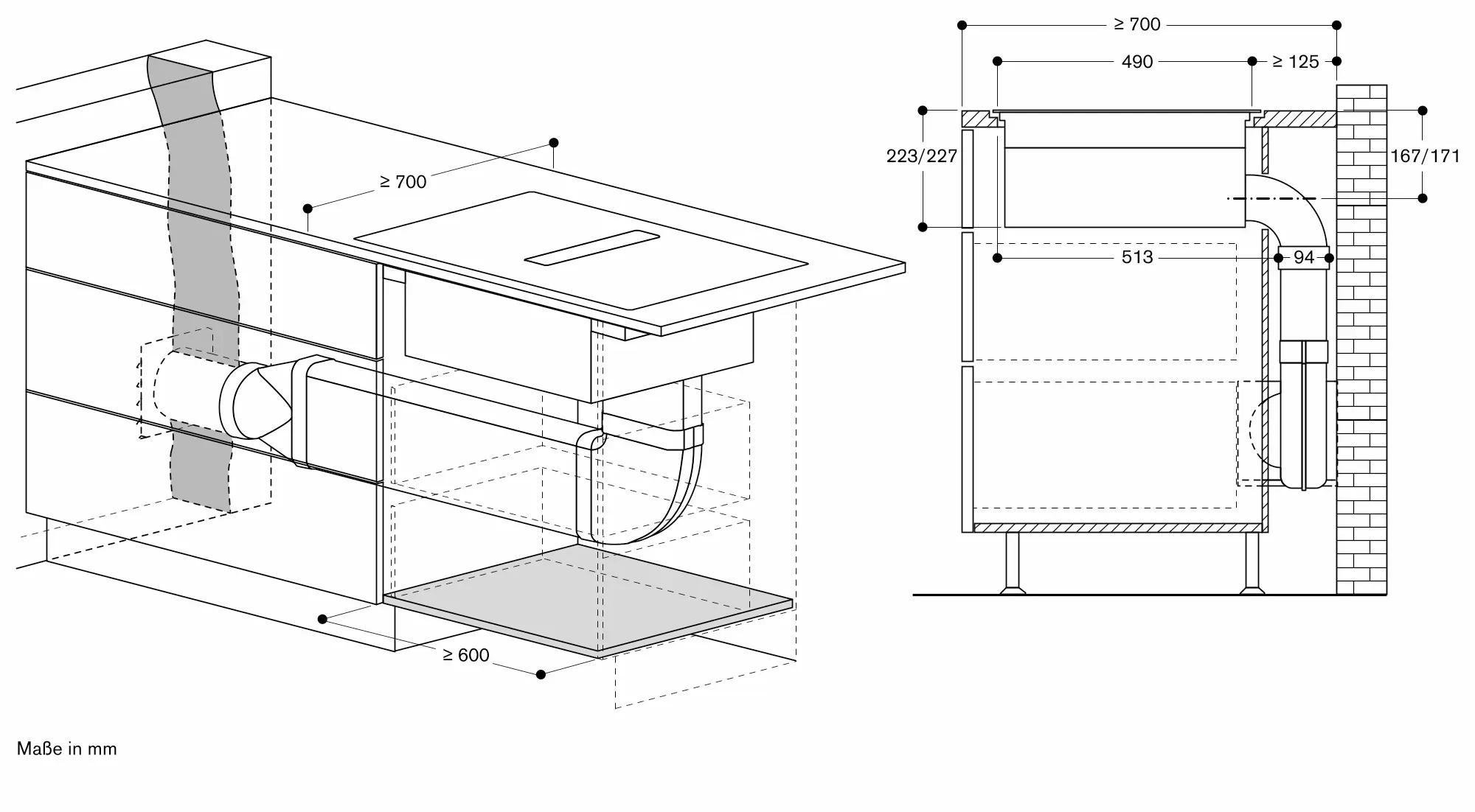 Arbeitsplattentiefe: min. 60 cm bei ungeführter Umluft, min. 65 cm bei geführter Umluft/Abluft.