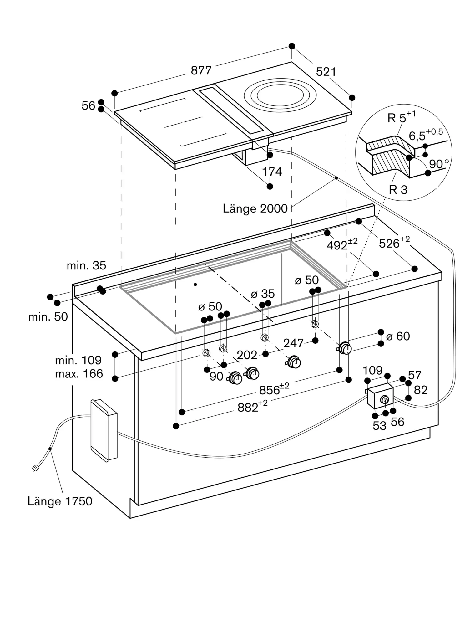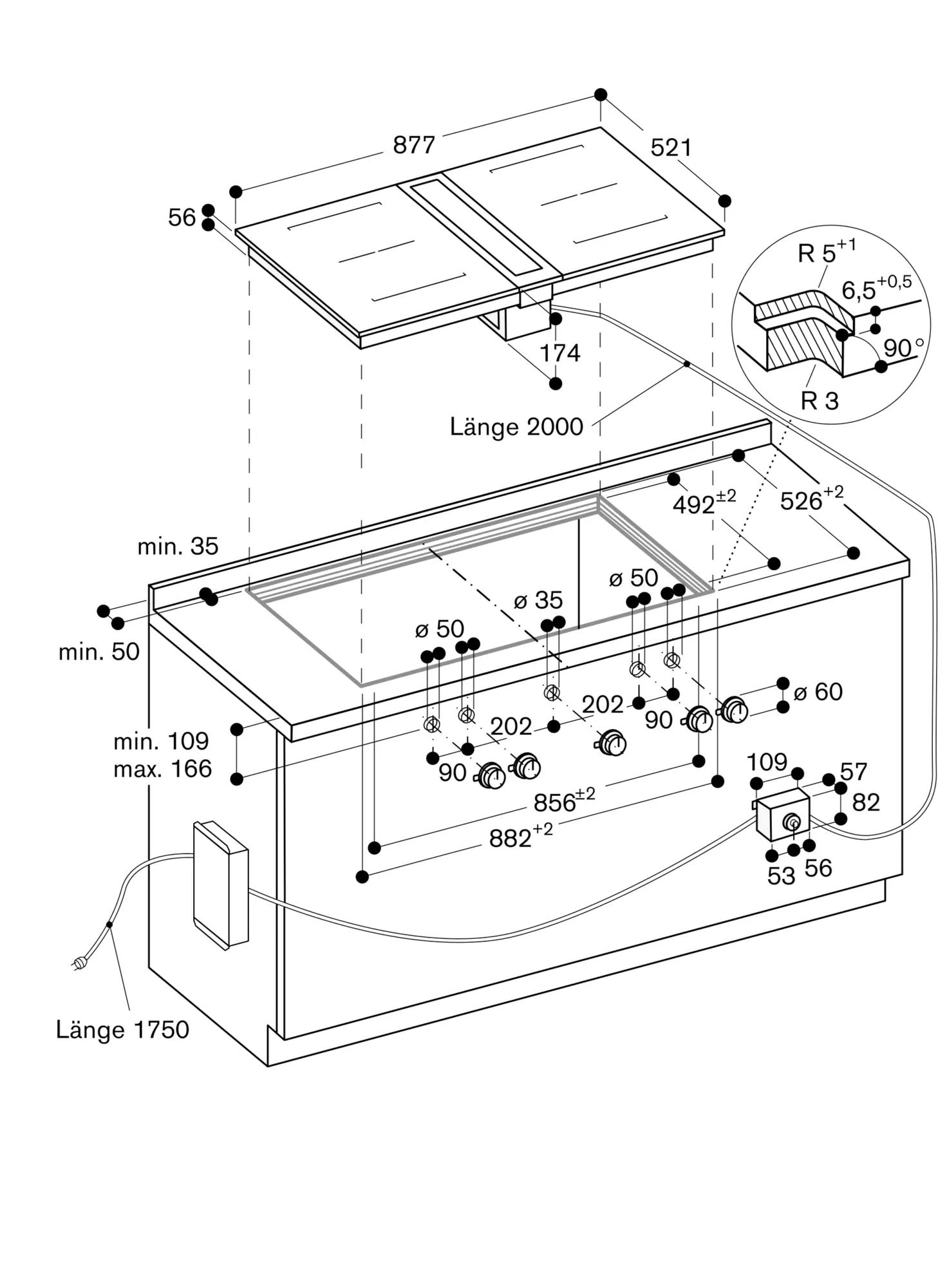 Durch Masstoleranzen der Glaskeramikscheibe und des Arbeitsplattenausschnittes kann die Fugenbreite variieren.