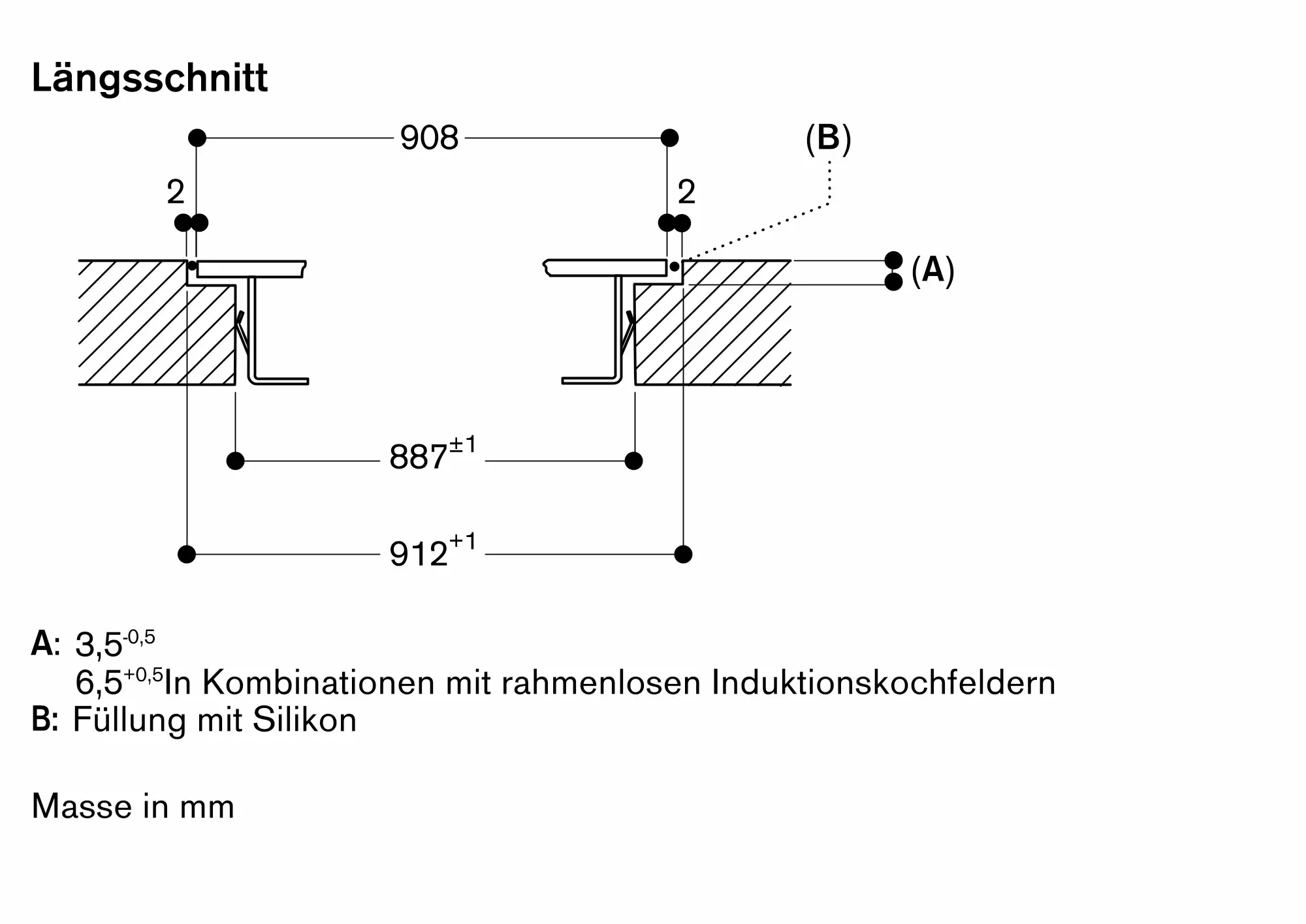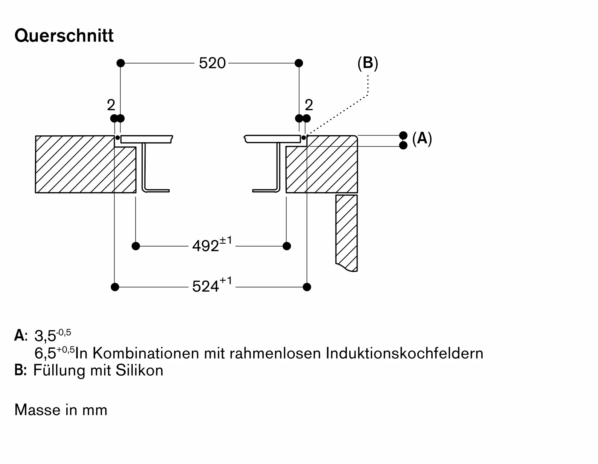 Der Einbau eignet sich in Arbeitsplatten aus Stein, synthetischem Material oder Massivholz. Hitzebeständigkeit und wasserdichte Versiegelung der Schnittkanten sind zu berücksichtigen. Bei anderen Materialien stimmen Sie sich bezüglich der Verwendung mit dem Arbeitsplatten-Hersteller ab.