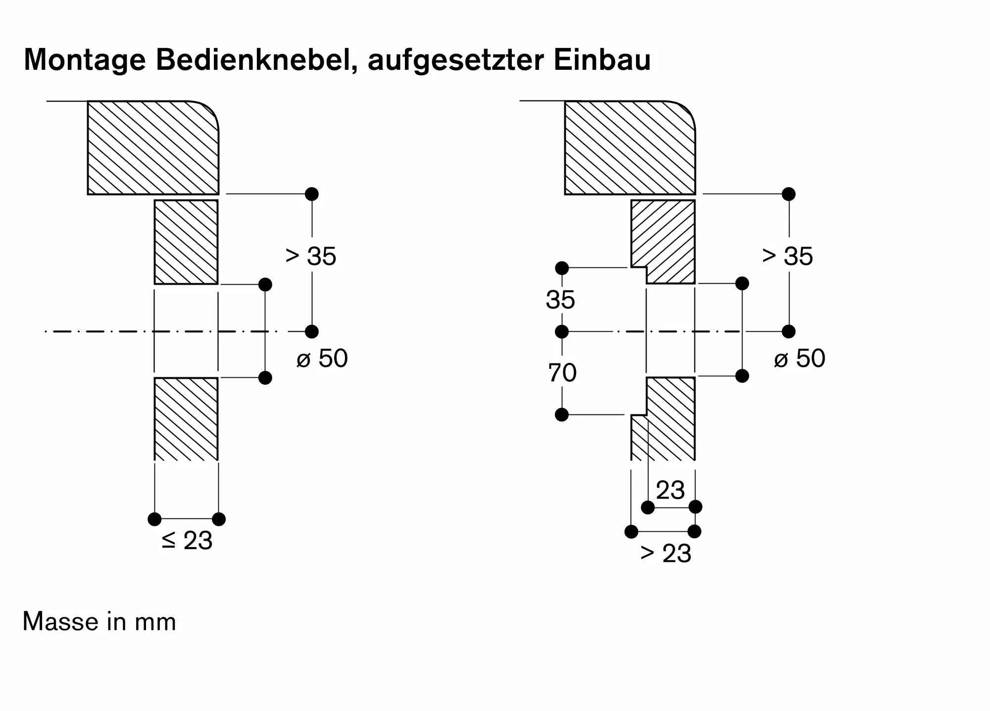 Wenn die Blendenstärke 23 mm überschreitet, muss die Skizze "Montage Bedienknebel" beachtet werden (hinten muss ausgespart werden).
