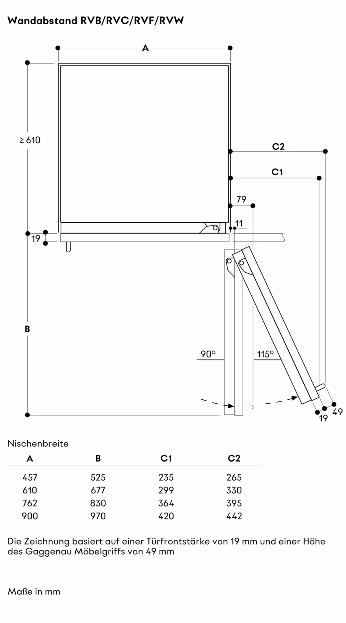 Türöffnungswinkel 115°, fixierbar auf 90°.