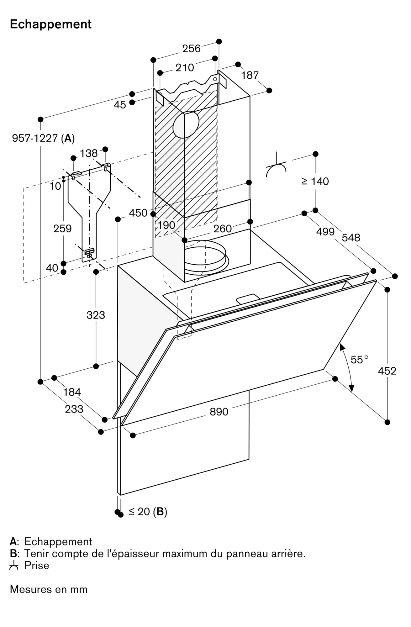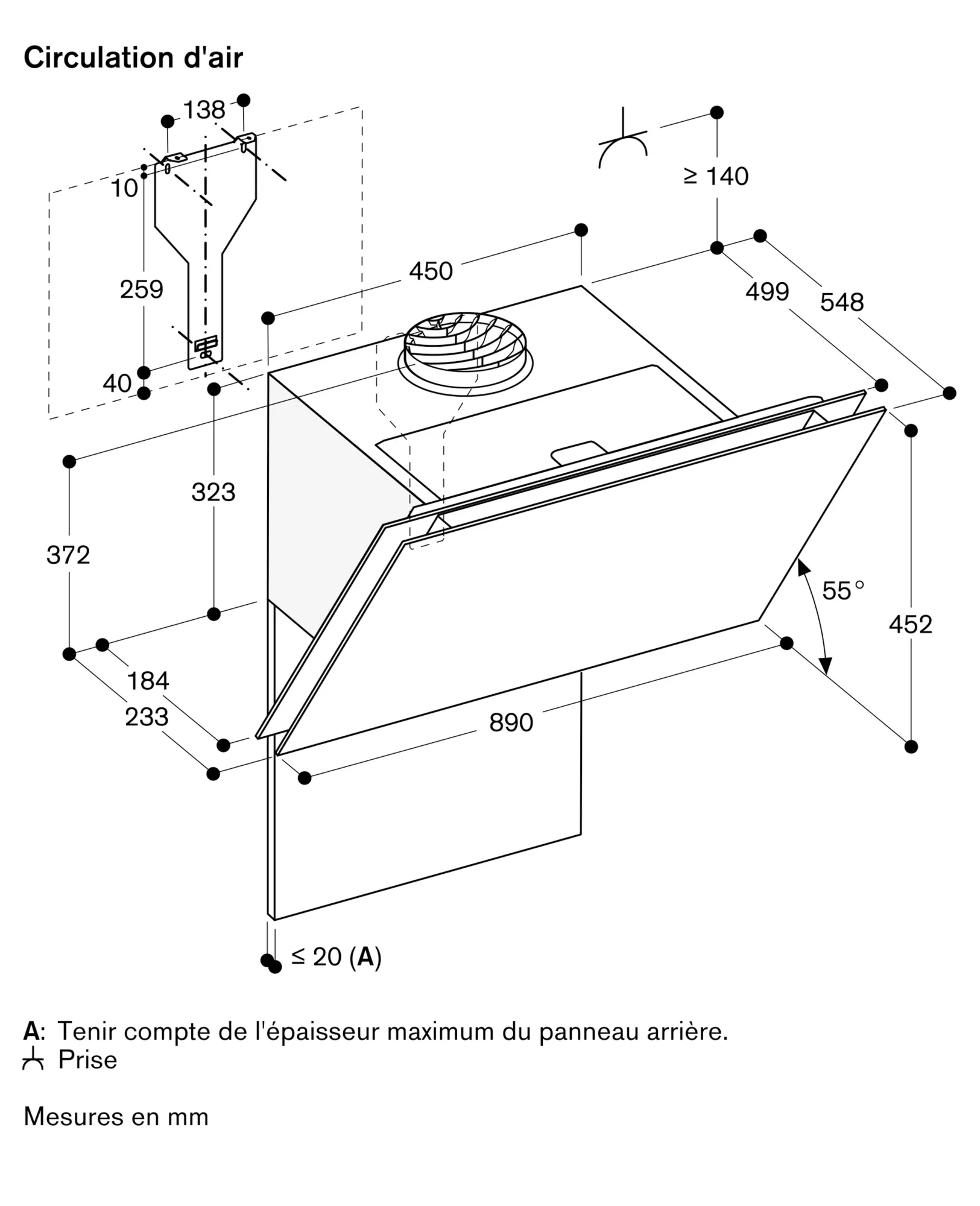 Distance minimale au-dessus d'une plaque gaz : 65 cm (minimum 70 cm si puissance totale du gaz est supérieure à 12 kW).