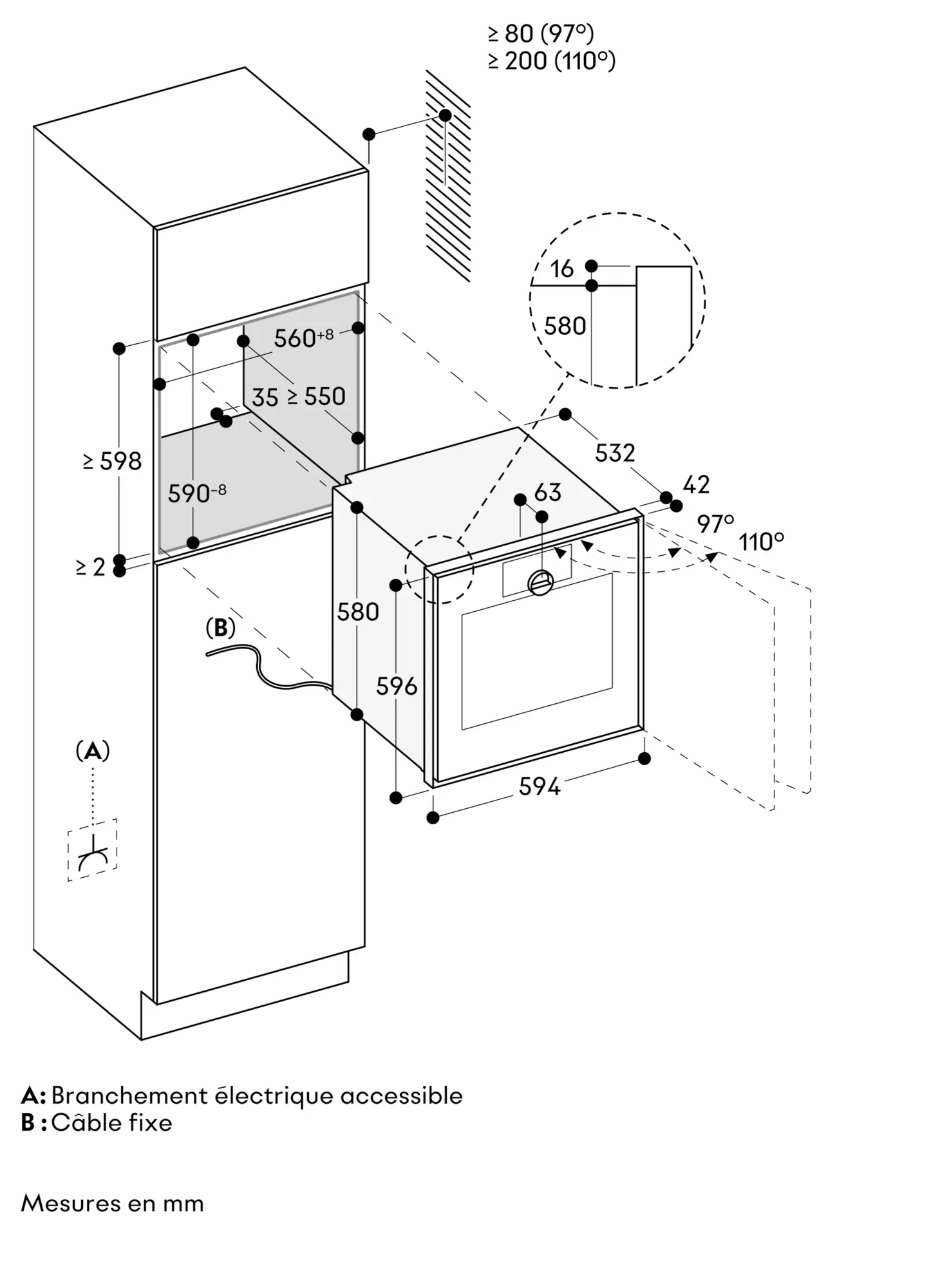 L'angle d'ouverture de la porte env. 110° (livré usine) peut être réduit à env. 97° si nécessaire.