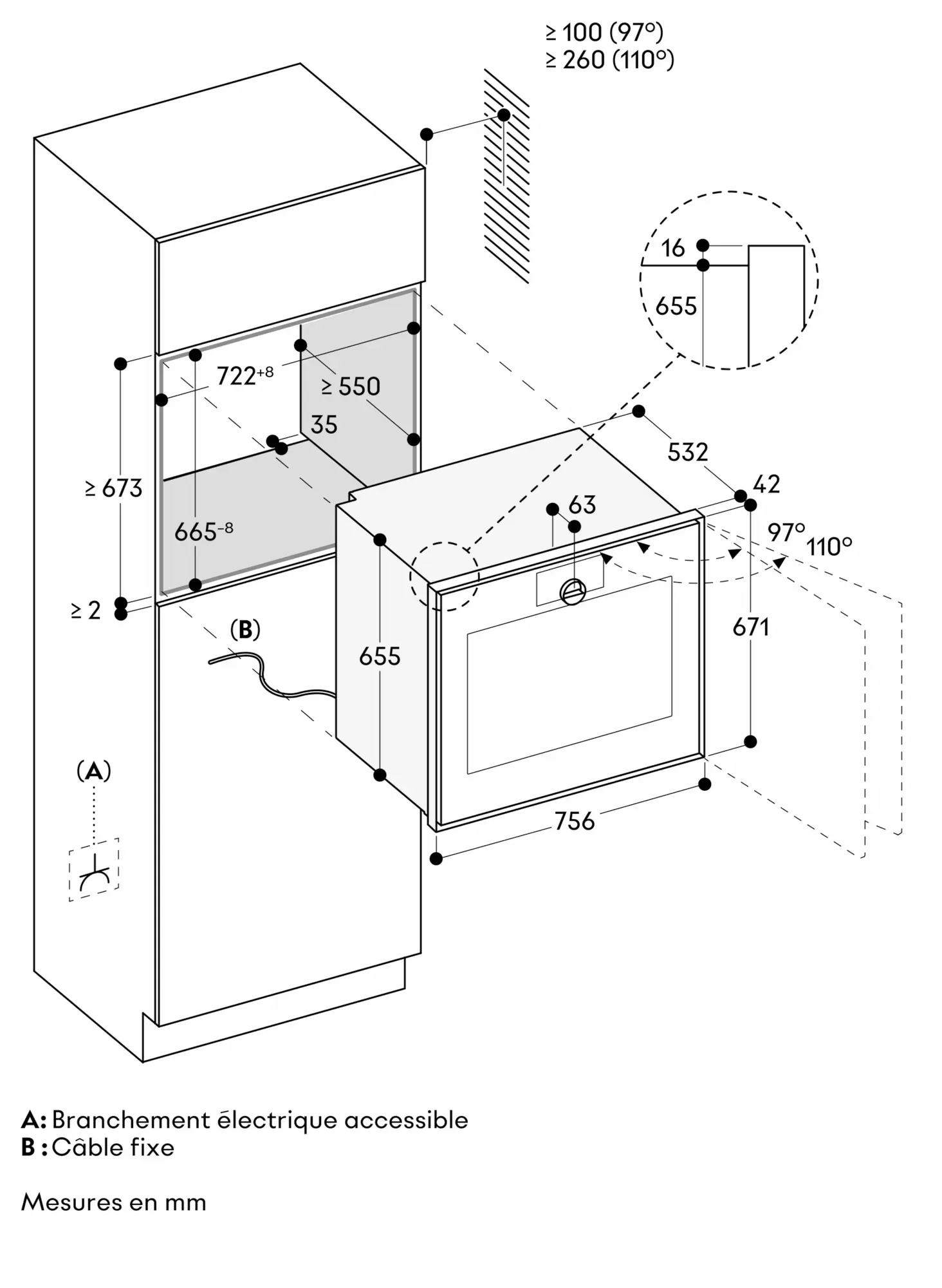 L'angle d'ouverture de la porte env. 110° (livré usine) peut être réduit à env. 97° si nécessaire.